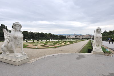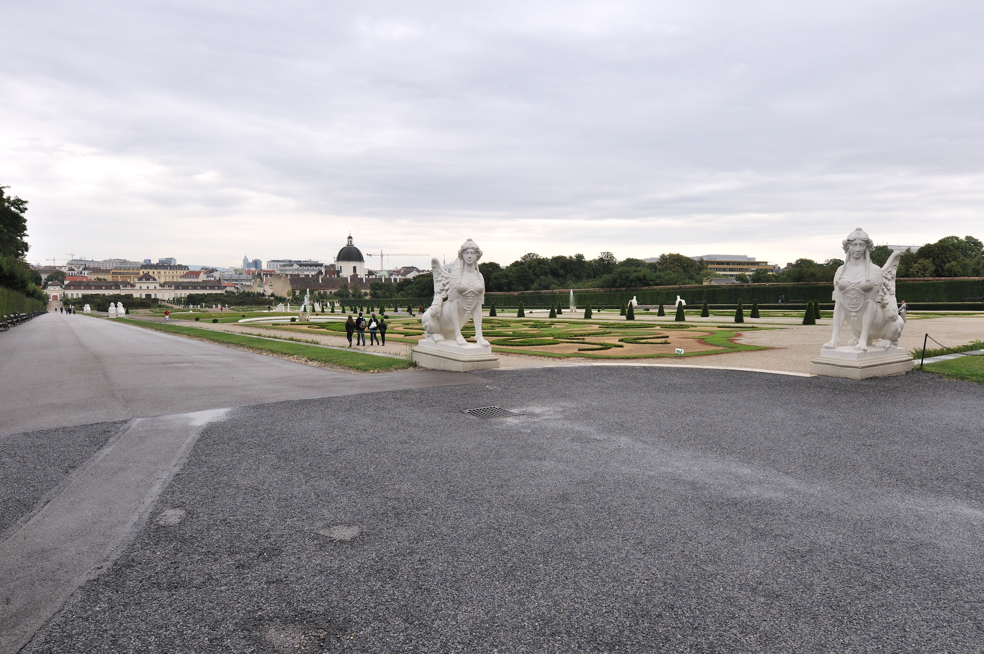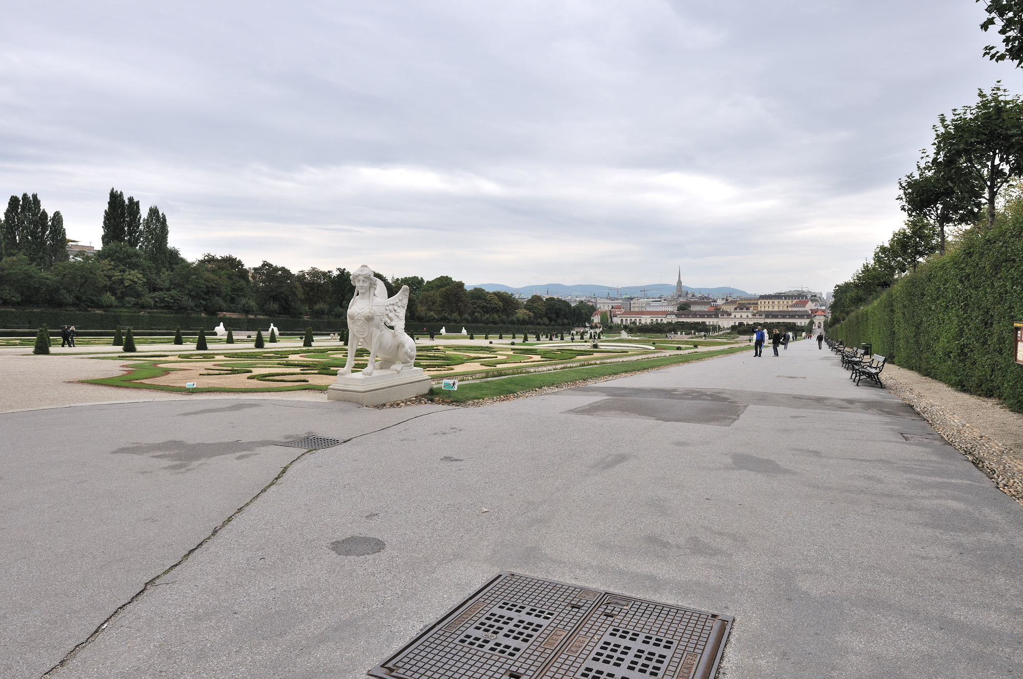 | ベルヴェデーレ宮殿 [Schloss Belvedere] のバロック庭園 (10:49)「北北東方向」MAP 上宮と下宮の間にあるバロック庭園、庭園を囲む位置にはスフィンクス像が配されている。 |