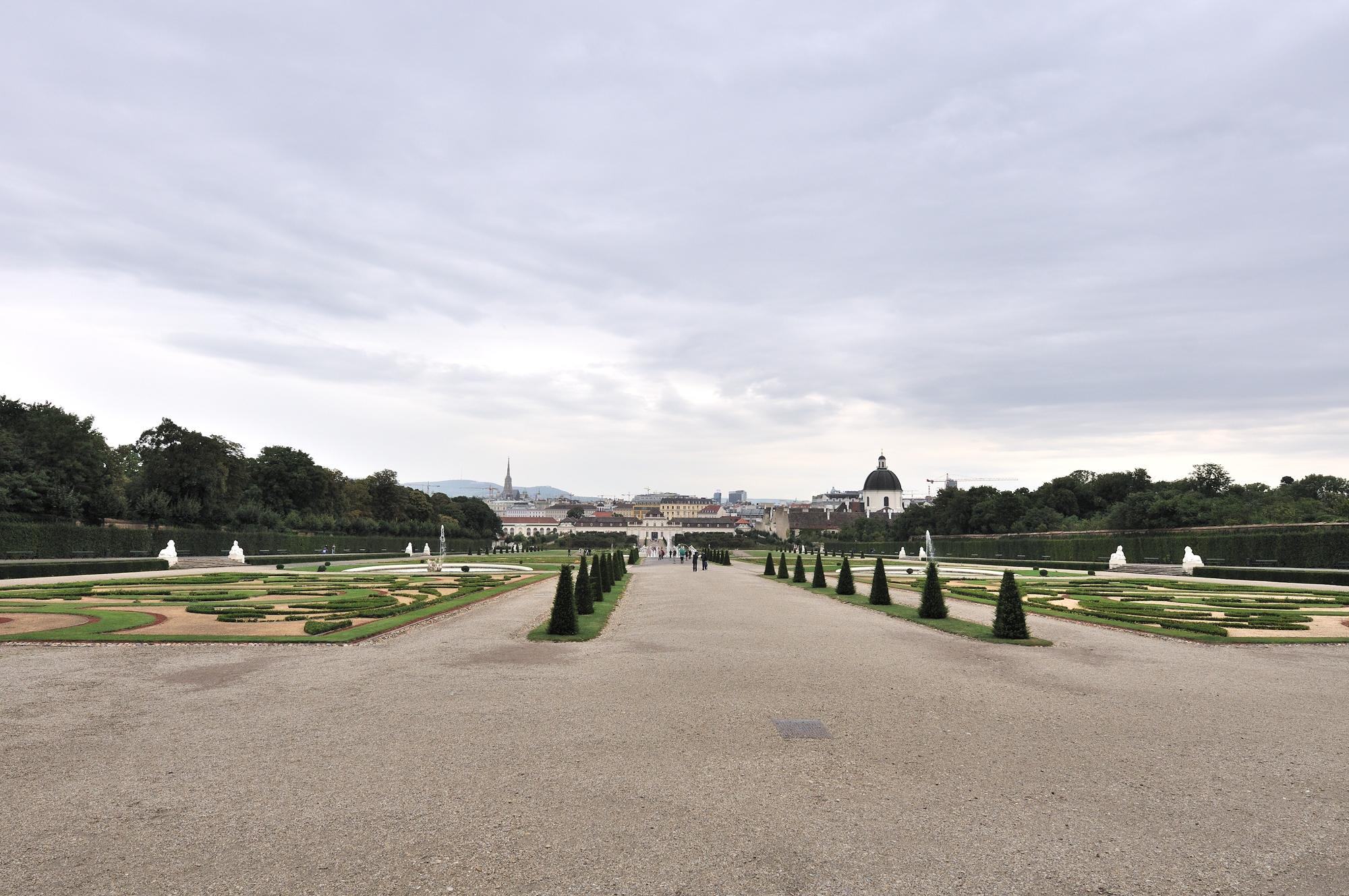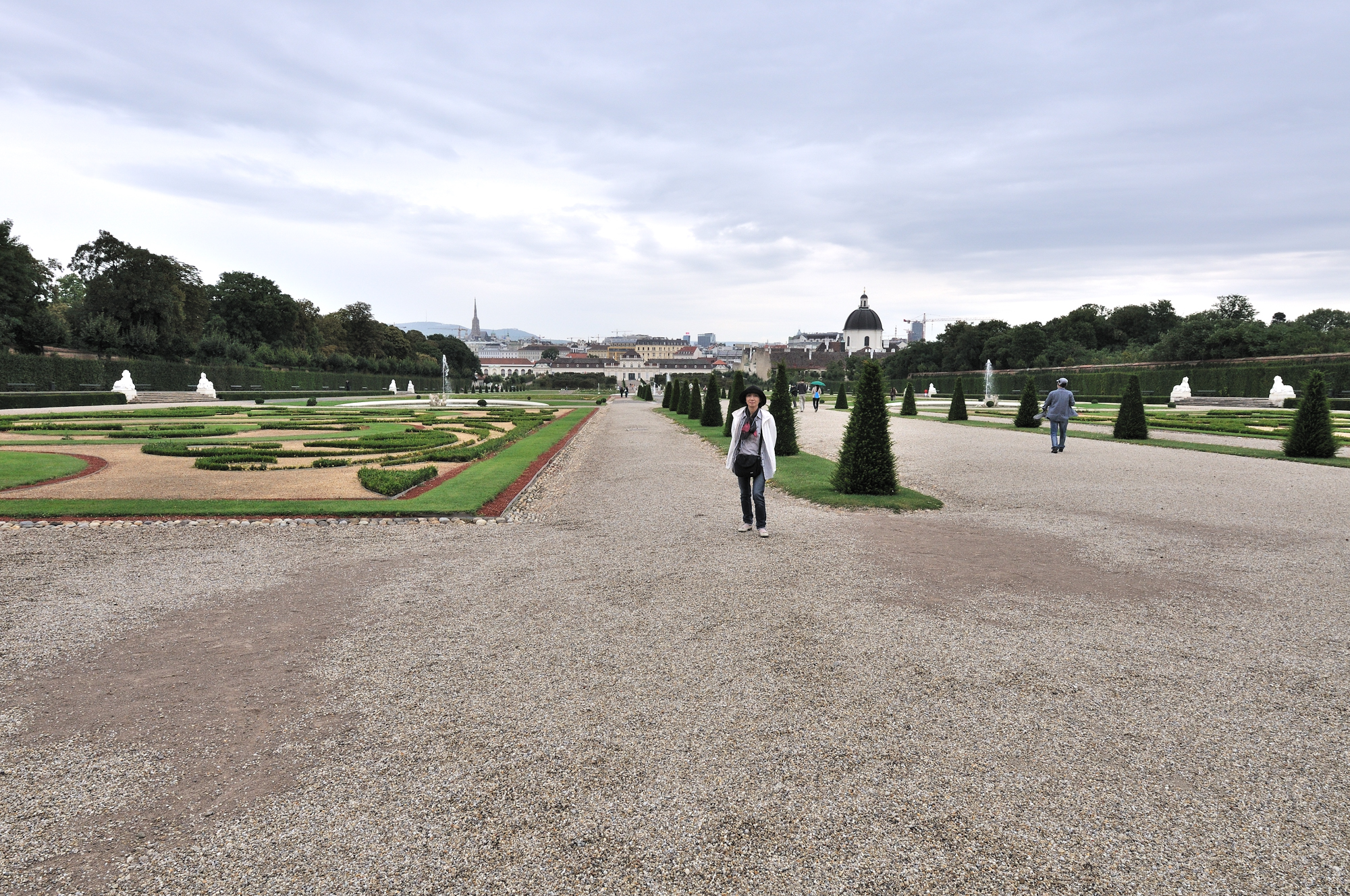 | バロック庭園と下宮 (10:50)「北方向」MAP 真向かいにある建物がベルヴェデーレ宮殿の下宮 [Unteres Belvedere] で、プリンツ・オイゲン公の豪華な居室や特別展示会場がある。 その左手に見える尖塔はシュテファン寺院 [Stephanskirche] の塔。 |