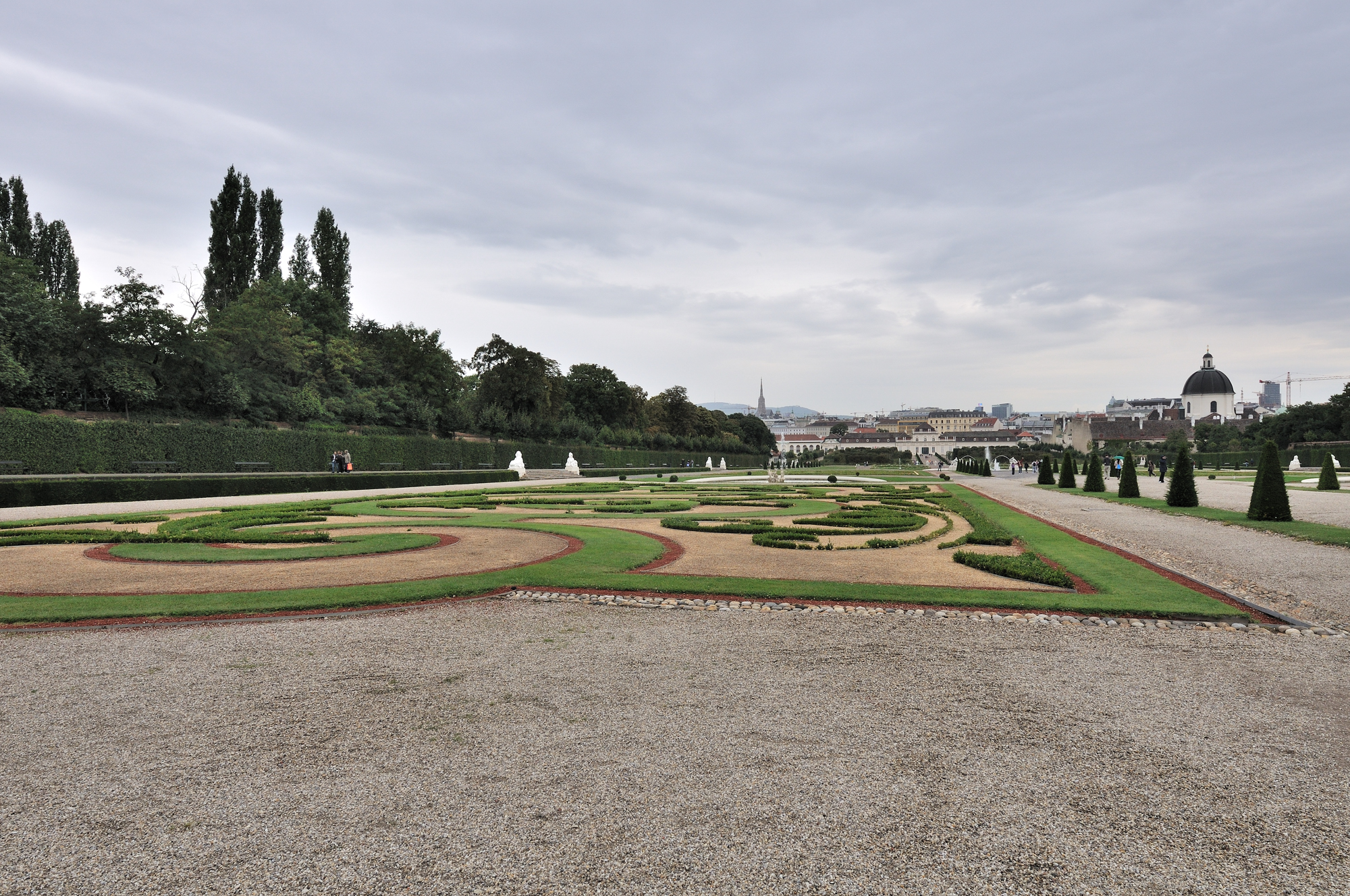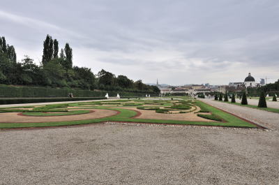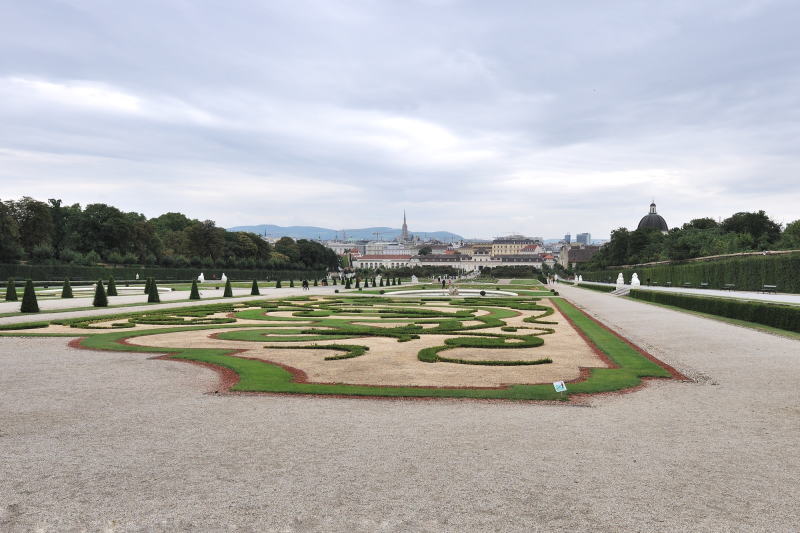 | ベルヴェデーレ宮殿 [Schloss Belvedere] のバロック庭園 (12:01)「北北西方向」MAP 中央に見える尖塔はシュテファン寺院 [Stephanskirche] の塔。 |