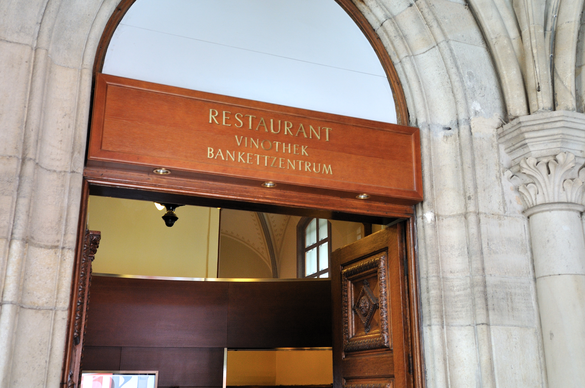 | 市庁舎地下のレストラン [Restaurants Wiener Rathauskeller] (13:14)「西北西方向」MAP 入口の上には、RESTAURANT、VINOTHEK、BANKETTZENTRUM と書かれている。 |
