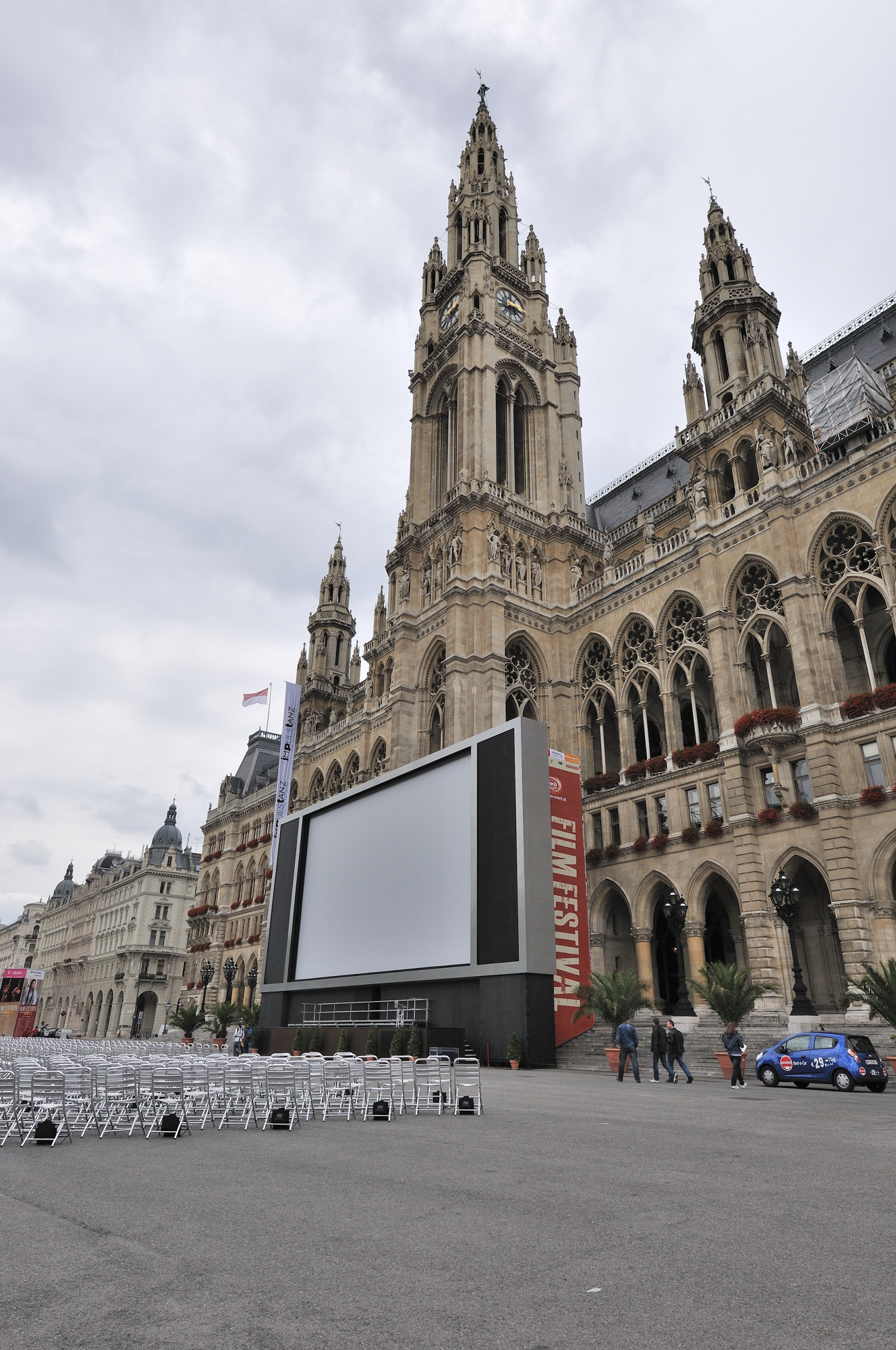 | 市庁舎広場 [Rathausplatz] (14:15)「南南西方向」MAP 野外映画祭のスクリーンが設えてあり、天気の良い夜はいつも映画をながしてくれる。 |