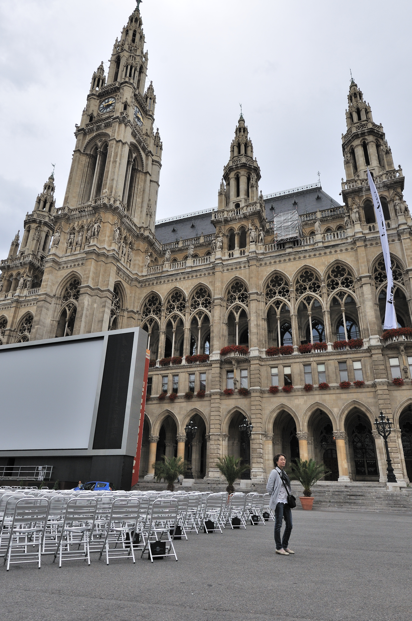 | 市庁舎広場 [Rathausplatz] (14:15)「西方向」MAP 野外映画祭のスクリーンが設えてあり、天気の良い夜はいつも映画をながしてくれる。 |