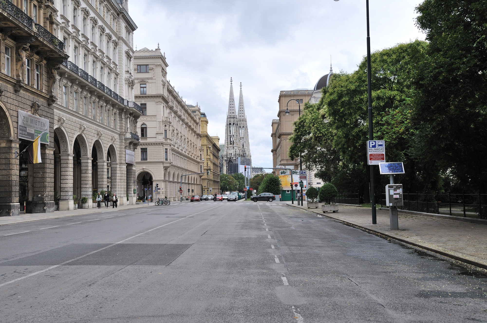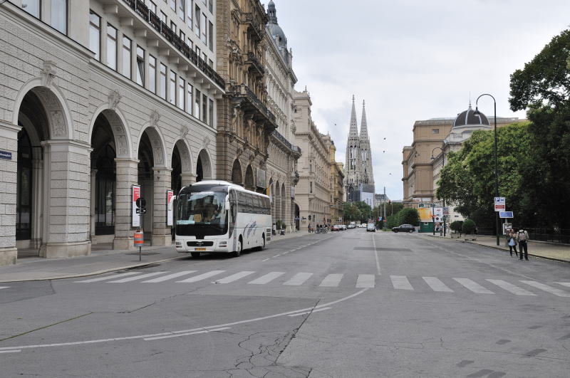 | ライヒスラーツ通り [Reichsratsstraße] (14:17)「北方向」MAP 通りの突き当たりに見える2つの尖塔は、ヴォティーフ教会 [Votivkirche] (奉納教会) の尖塔で、1853年に皇帝フランツ・ヨーゼフ1世がテロによる暗殺から無傷で逃れられたことを神に感謝し、弟で後のメキシコ皇帝マクシミリアンによって1856年から1879年にかけて建てられた。 |