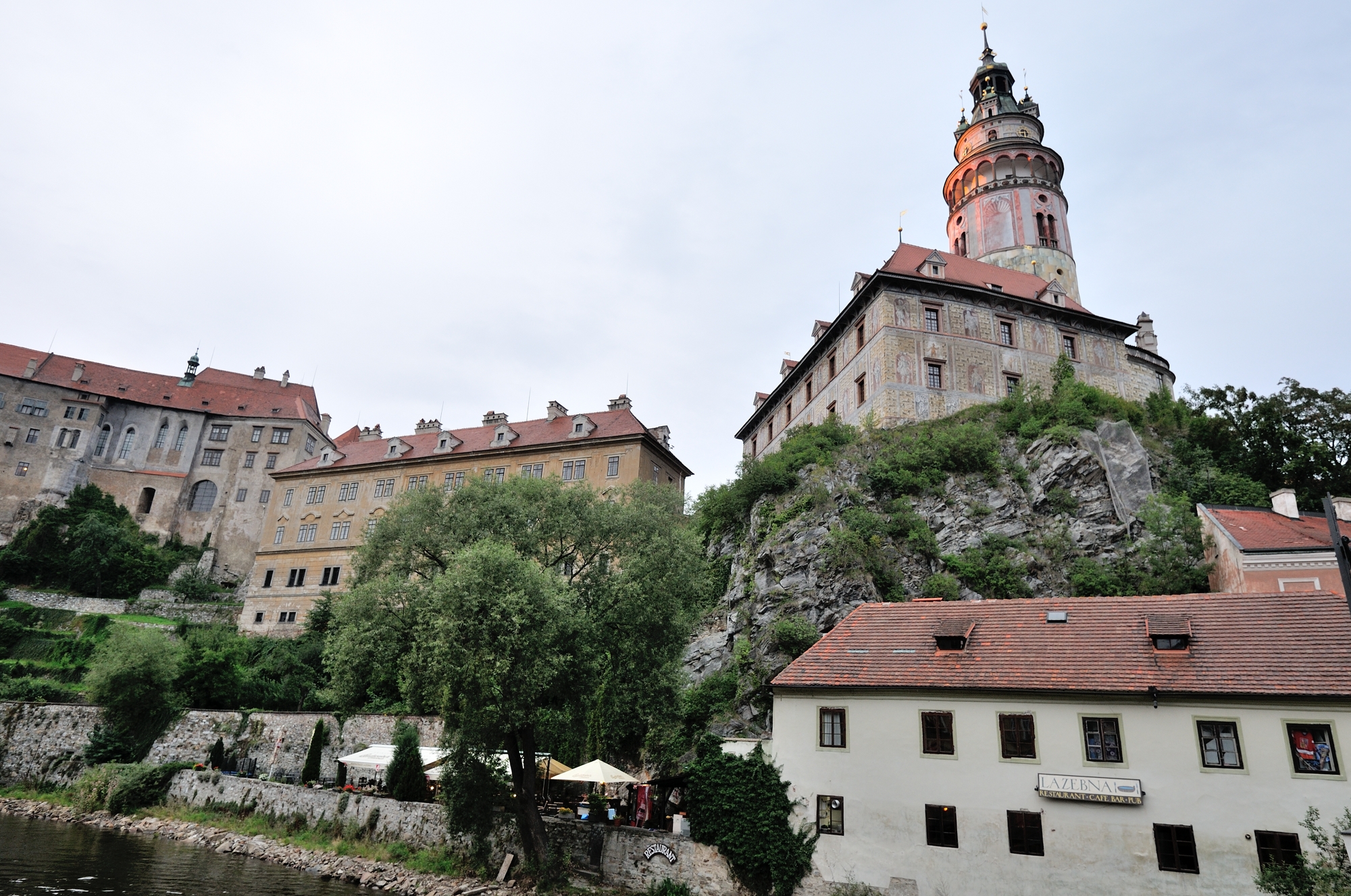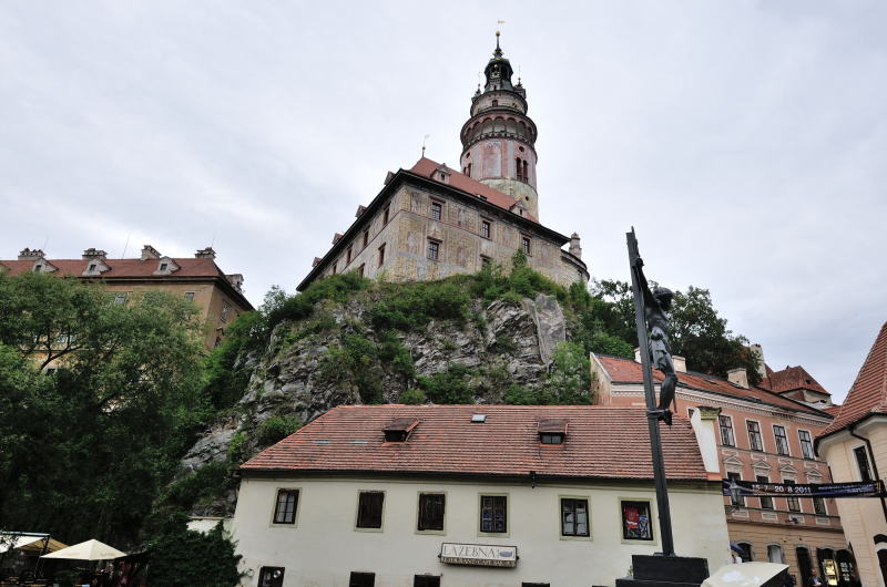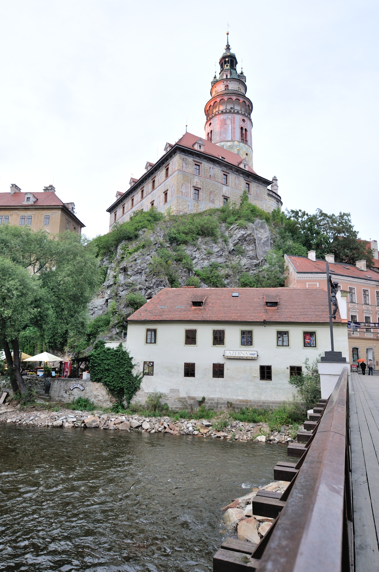 | チェスキー・クルムロフ城 [Castle Český Krumlov] (20:30)「北方向」MAP 塔の下にある家の壁には "LAZEBNA" と書かれた看板が掛かっているが、ここはかつて床屋 [Lazebnic] であった名残で、現在はレストラン、カフェ、バー、パブ として使用されている。 すぐ側にある橋は16世紀の頃から床屋橋 [Lazebnický most] と呼ばれていた。 |