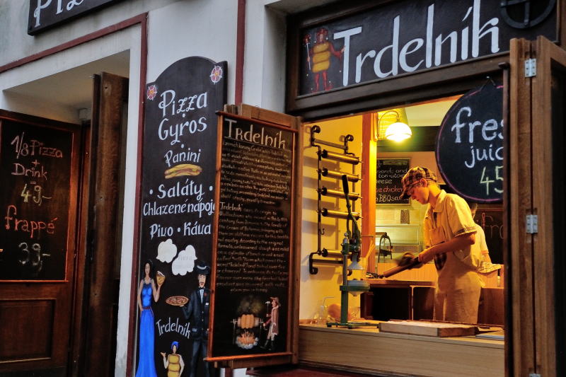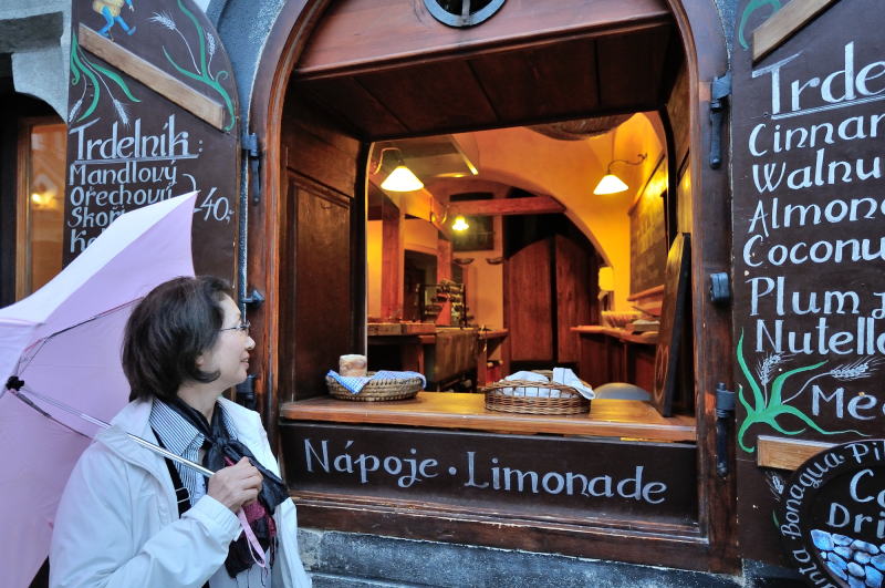 | トゥルデルニーク [Trdelnik] の店 (20:40)「東北東方向」MAP トゥルデルニーク [Trdelnik] は小麦粉の生地を引き延ばし、金属製の丸いパイプに巻き付けて、パイプを回転させながら焼いた竹輪状の菓子。 焼き上がった後に砂糖とかシナモンなどをまぶして仕上げてあるチェコ伝統のお菓子。 |