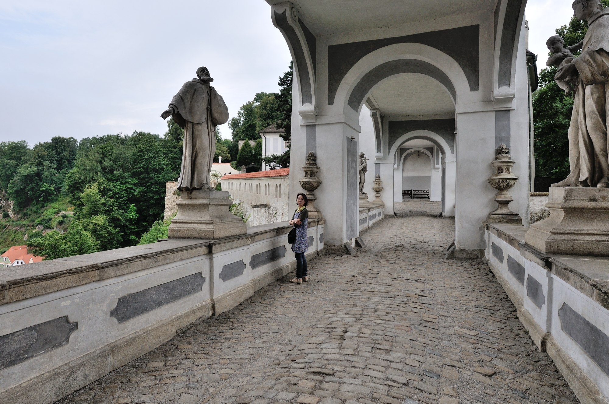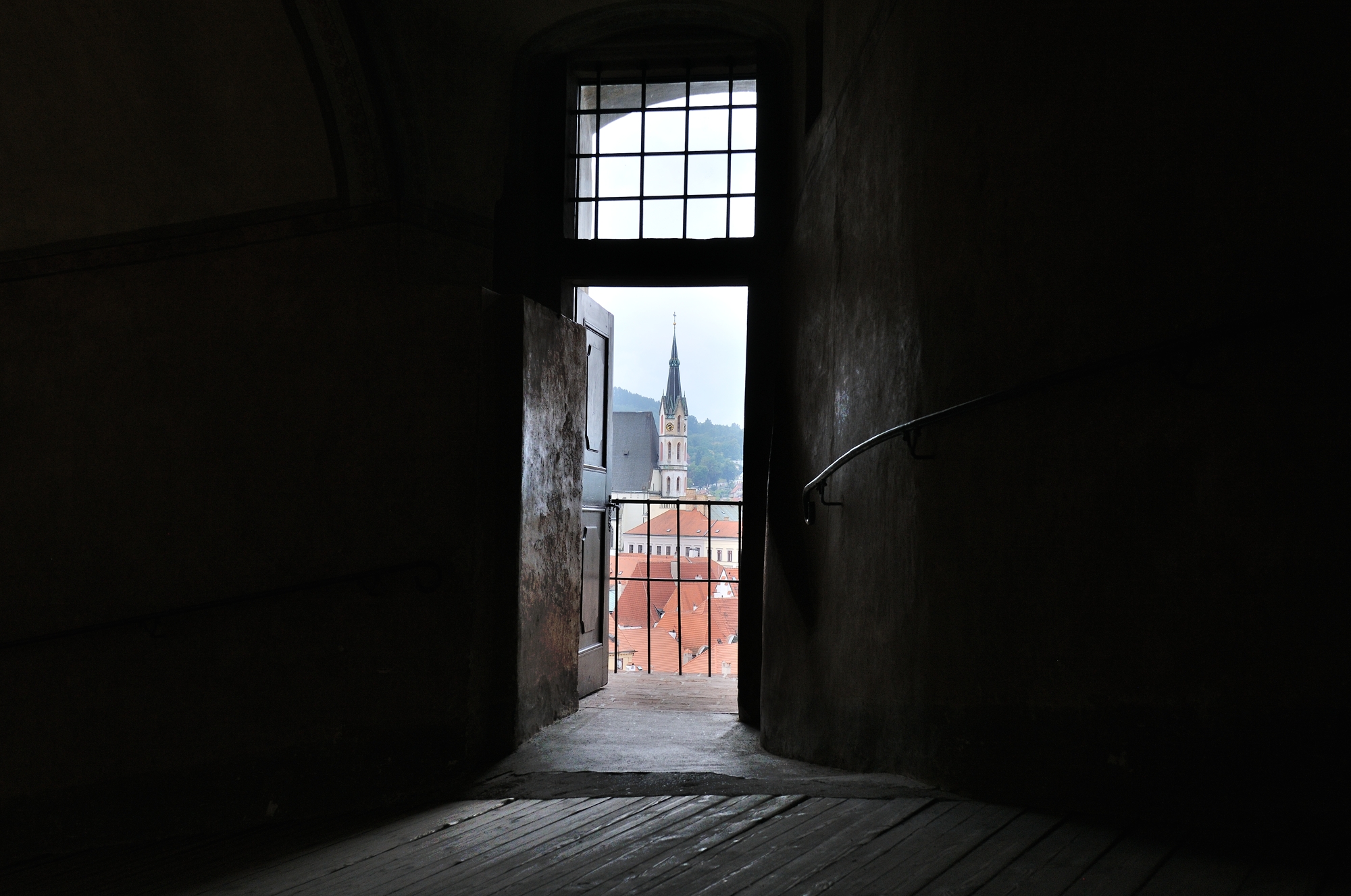 | 通路の途中に設けられたテラス (08:08)「南南東方向」MAP 第3中庭から第2中庭への通路途中に設けられたテラスからは、聖ヴィート教会 [St.Vitus Church] の塔が顔をのぞかせている。 |