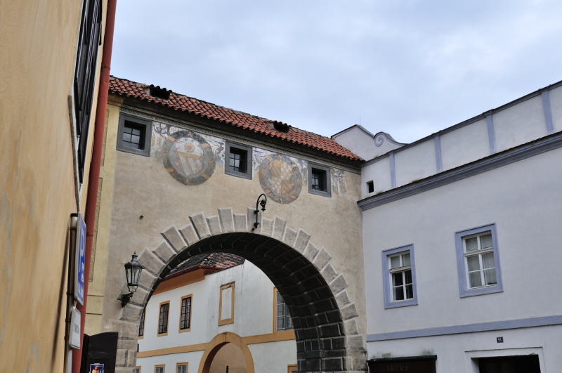 | ホテル・リュゼ [Hotel Růže] (11:45)「南東方向」MAP ホルニー通り [Horní] に面した位置にあるホテル・リュゼ (薔薇) [Hotel Růže] の門。 |