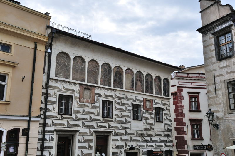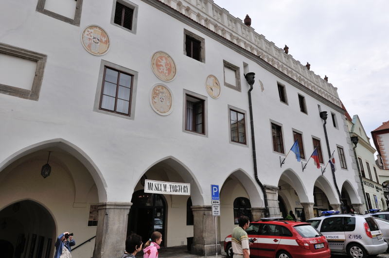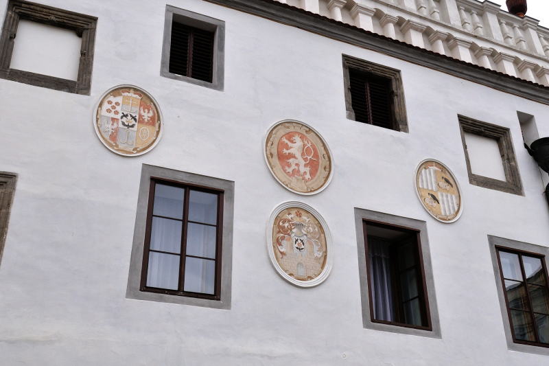 | ルネサンス時代の市庁舎 (11:30)「東北東方向」MAP 壁面には4つの紋章が掲げられている。 右はシュヴァルツェンベルク家 [Schwarzenberku] の紋章、左はエッゲンベルク家 [Eggenberg] の紋章、真ん中の上はチェコの紋章 (ボヘミヤライオン) 、その下はチェスキー・クルムロフの紋章。 |