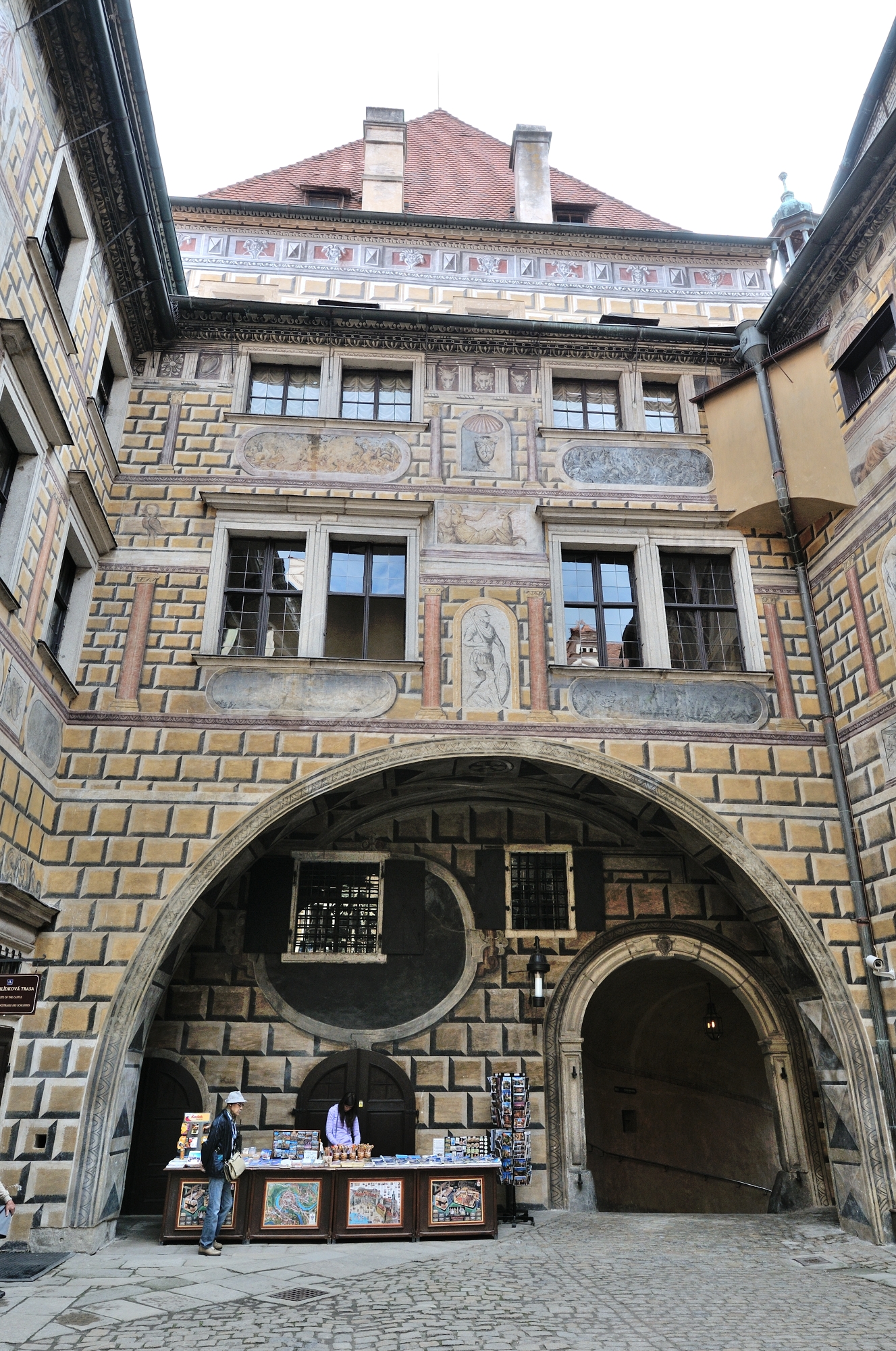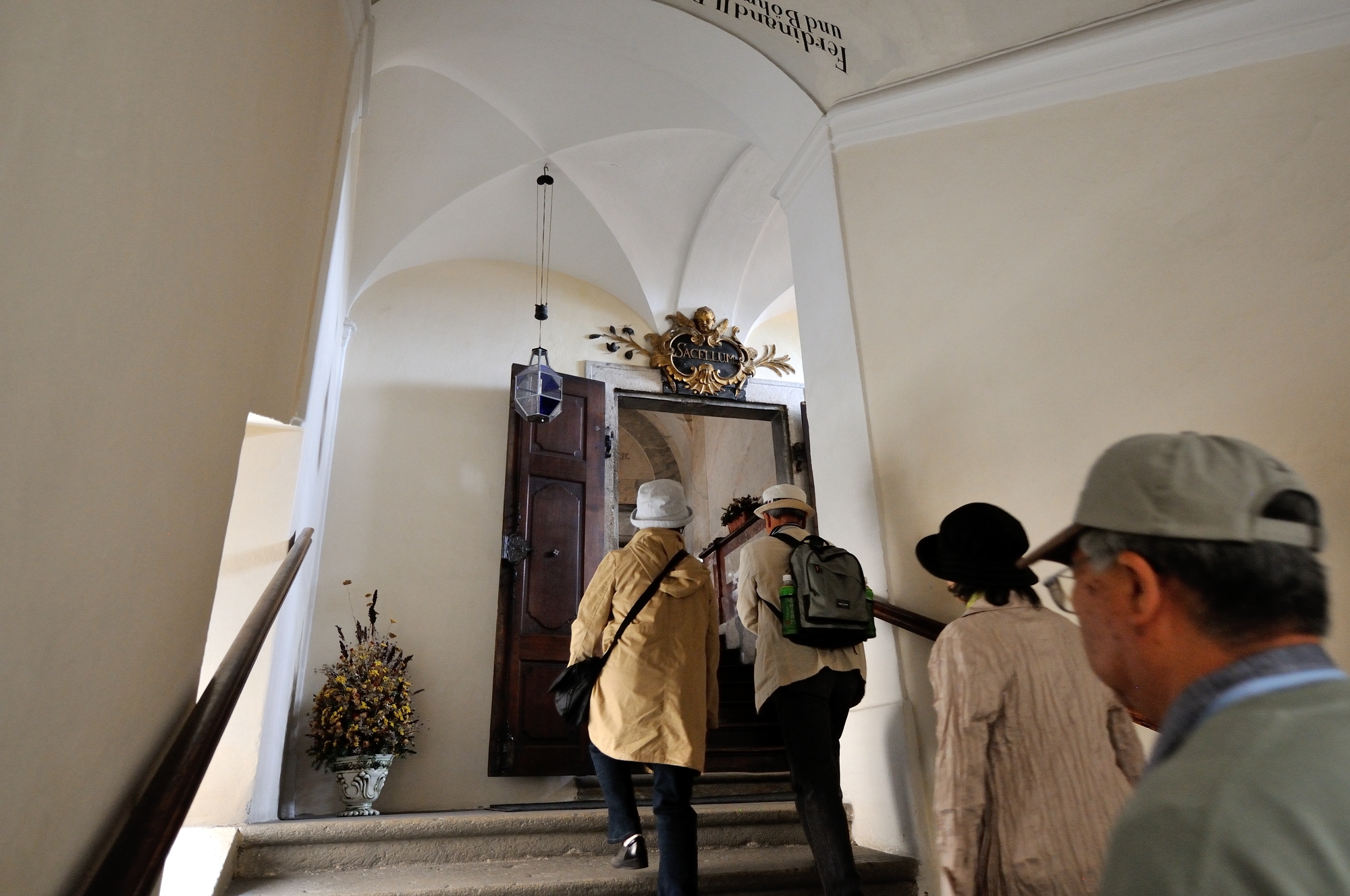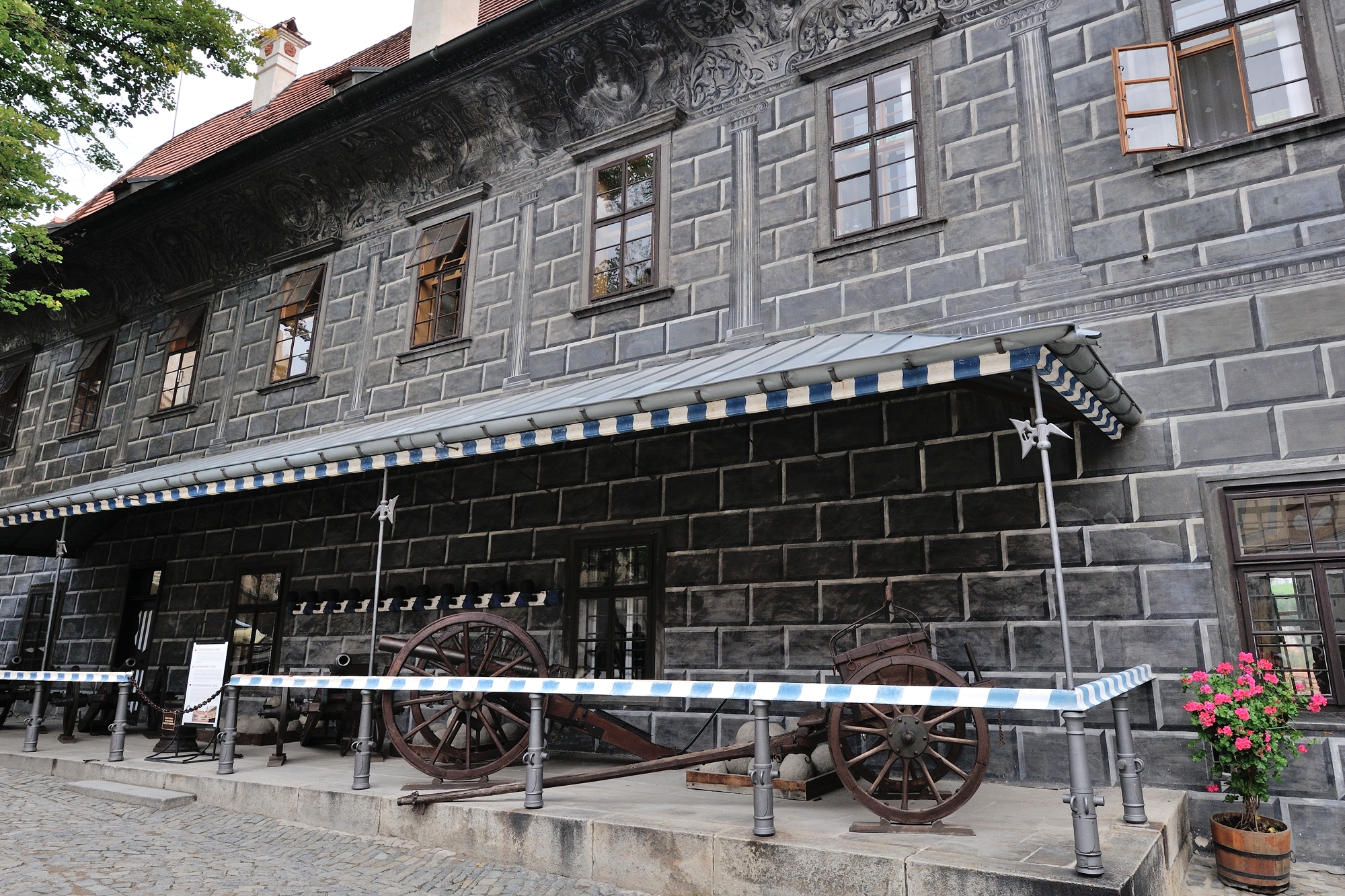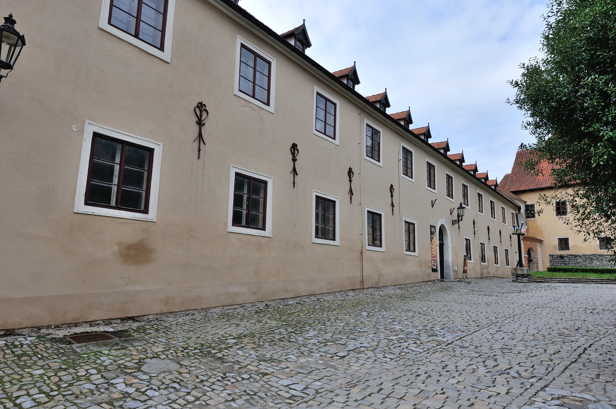 | かつて兵舎であった建物 (09:30)「北西方向」MAP 衛兵の組織はチェスキー・クルムロフで18世紀に結成され、彼らは単に城を守るのみではなく、要人がプラハやウィーンに赴くとき護衛としての役目も果たしていた。 また楽士でもあった彼らは、週末、町で演奏会を開き民衆を楽しませていた。 現在は城の図書館として使われている。 (第2の中庭) |