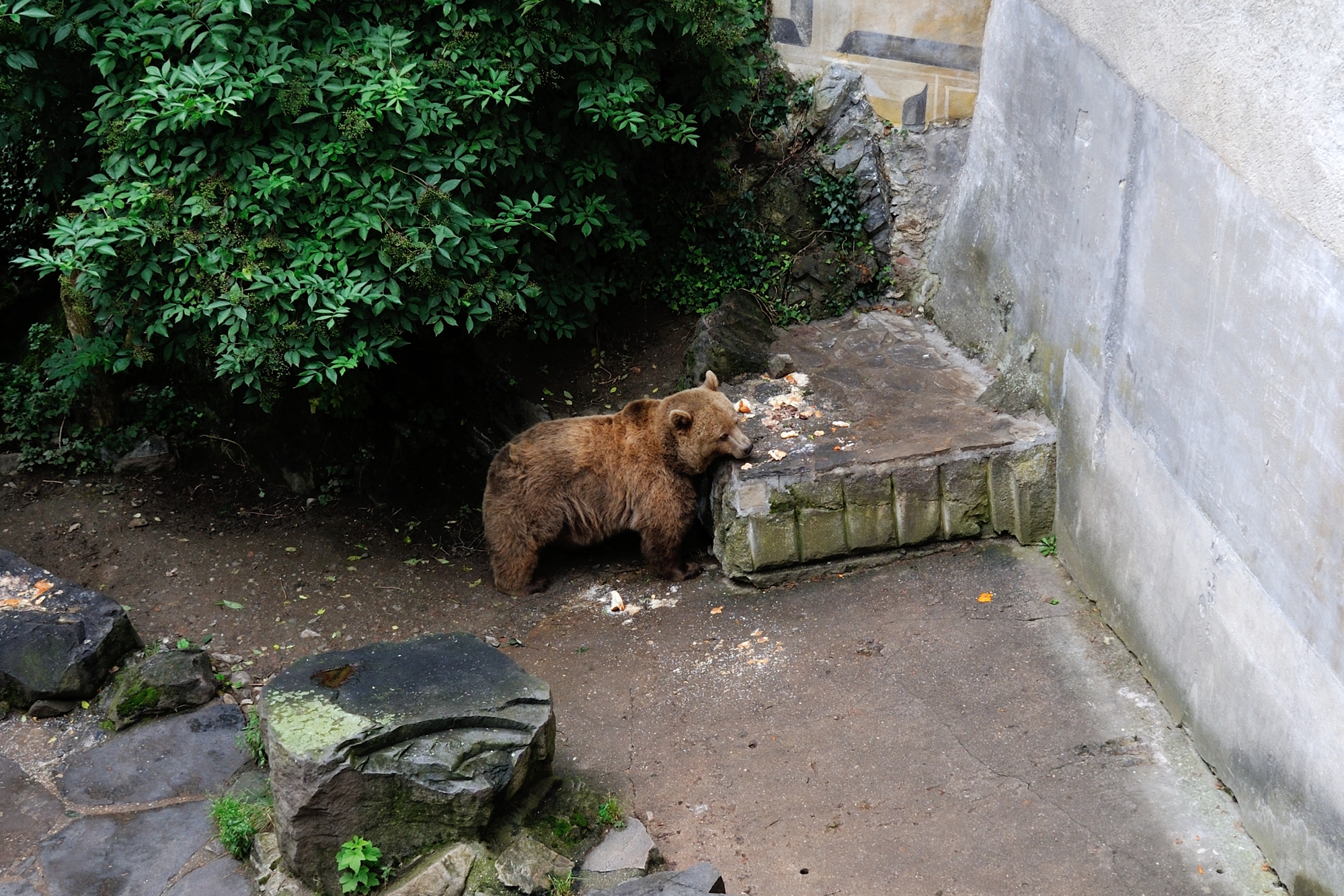 | 城の外堀には3頭の熊が飼われている (09:28)「南南西方向」MAP ローゼンベルク家のローゼは薔薇が語源で、紋章には五弁の赤い薔薇が使われているが、その他、ローゼンベルク家のシンボルとして熊が存在する。 ローゼンベルク家はイタリアの有名なオルシーニ家の子孫であり、オルシーニ家のオルシーニは熊を意味する言葉であることから、堀にはオルシーニに因み、3頭の熊が飼われている。 |