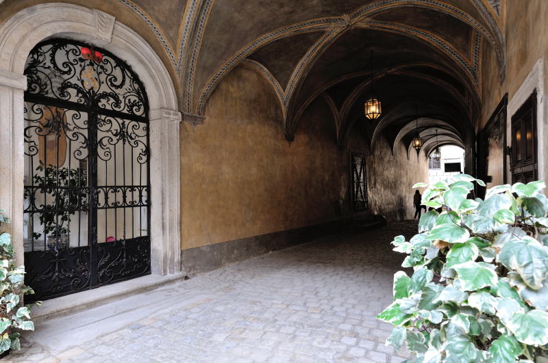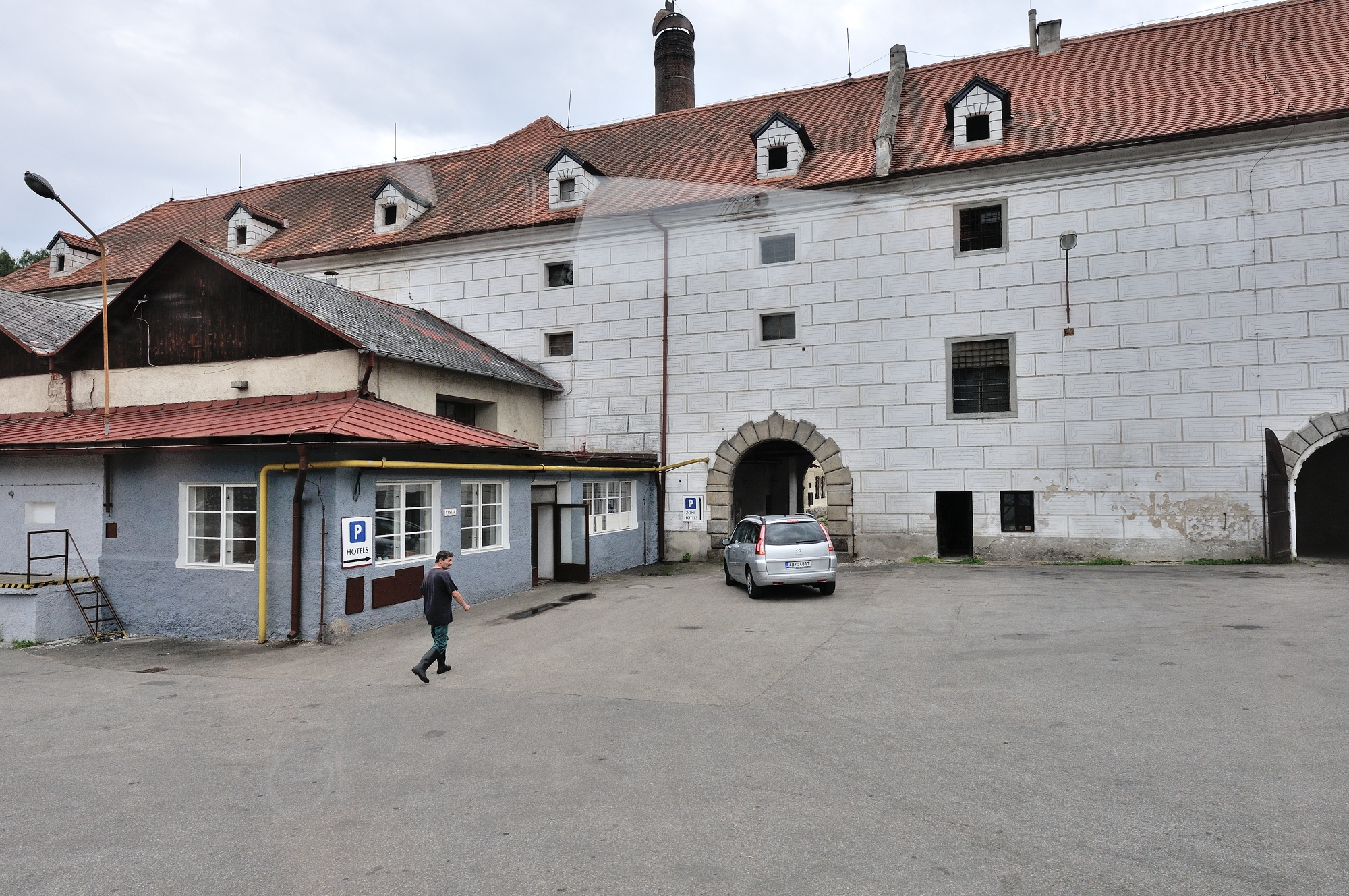 | かつて製塩所だった建物 (09:25)「西北西方向」MAP 18世紀頃、塩はチェコでは採れずオーストリアのザルツブルク (MAP) (ザルツは塩、ブルクは砦 の意) から運んでいた。 そのため塩は大変貴重であった。 (第1の中庭) |