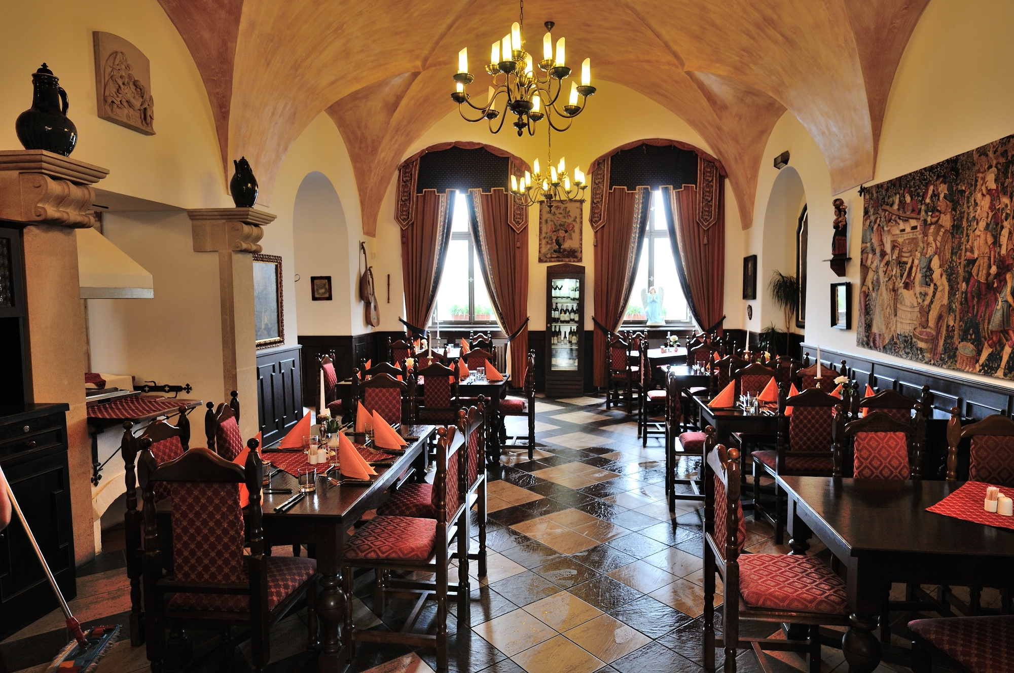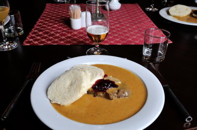 | スビチコバ・ナ・スメタニェ [Svickova na Smetane] 伝統的なチェコ料理で、サーロインステーキに甘めのクリームソースをかけ、さらにステーキの上にはグランベリーのジャムと、ホイップクリームを載せて、付け合わせのクネドリィキ [Knedliky] (チェコの蒸しパン) と一緒に食べる。 パンにジャムなら普通だが、ステーキにジャムは戸惑ってしまうかも ⁉ |