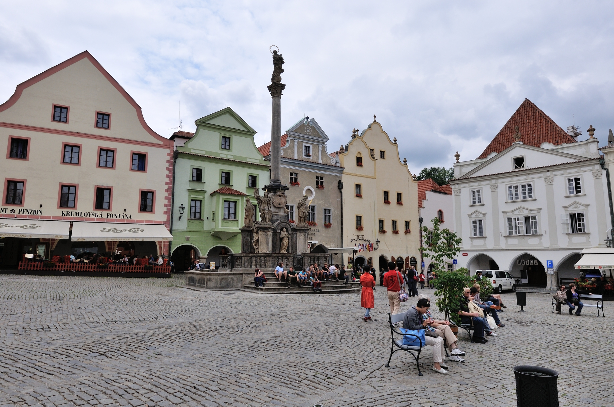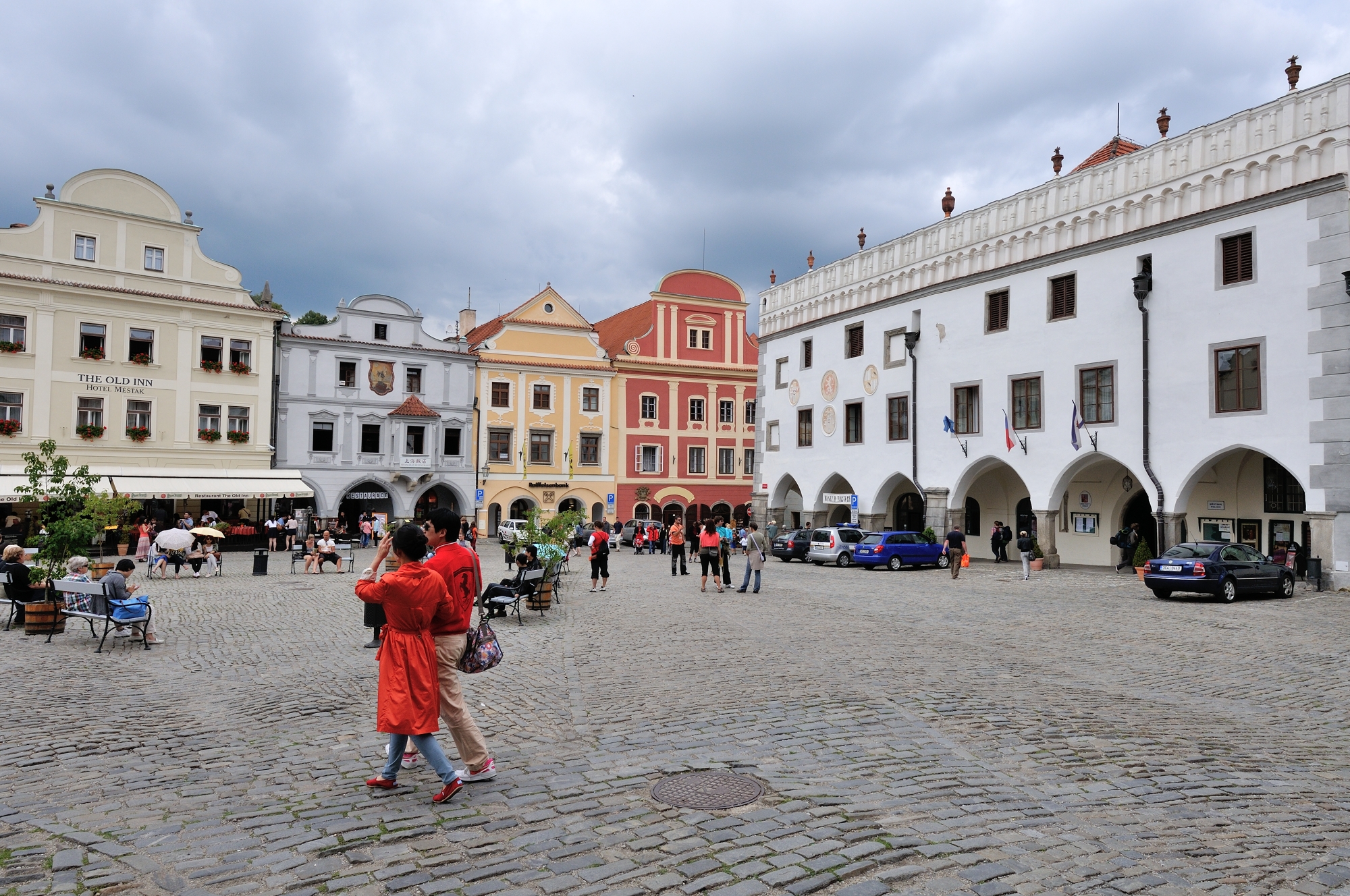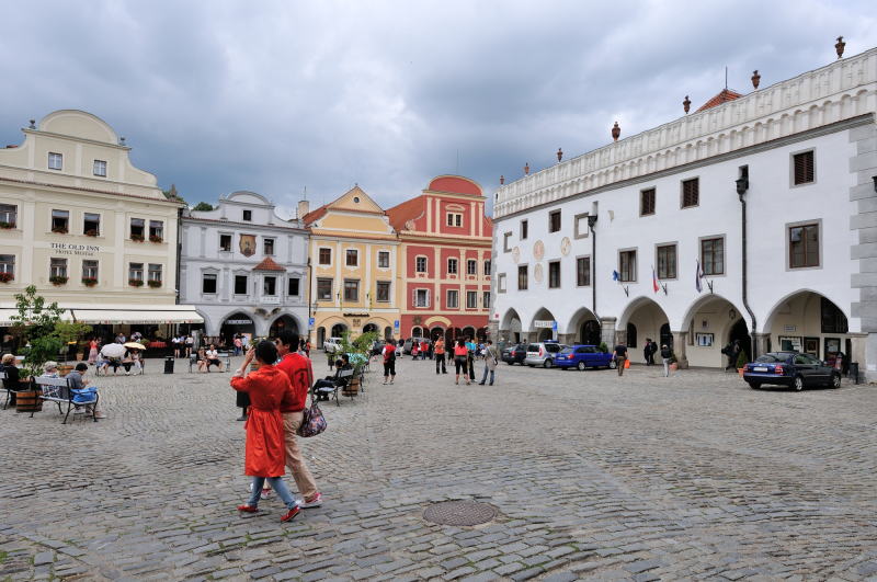 | ルネサンス時代の建物 (11:39)「東方向」MAP 右の白い建物は、16世紀頃はイエズス会の修道院だったが現在はホテル・リュゼ(薔薇) [Hotel Růže] として使用されている。 後に、このホテルのレストランにて昼食をいただく。 |
