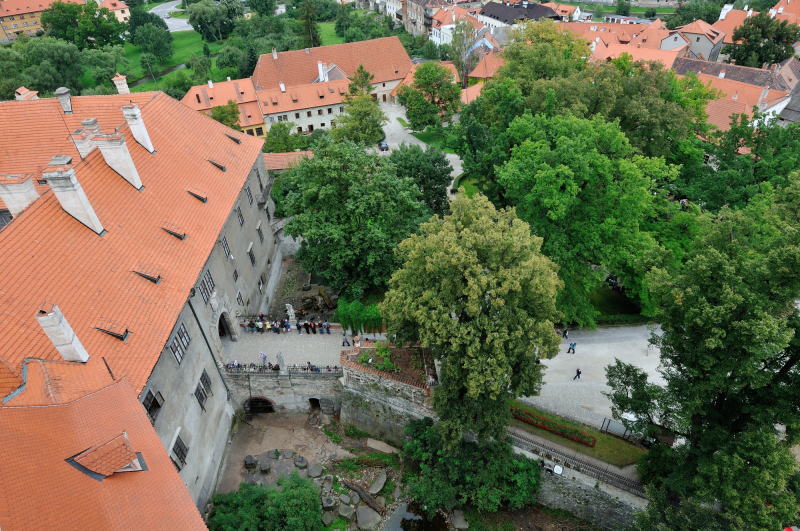 | チェスキー・クルムロフ城の塔からの眺め (13:34)「北方向」MAP 左手の門をくぐるとチェスキー・クルムロフ城の第2の中庭へ通ずる。 右手に見える広場はチェスキー・クルムロフ城の第1の中庭。 その間にある橋の下には3頭の熊が飼われている堀。 |
