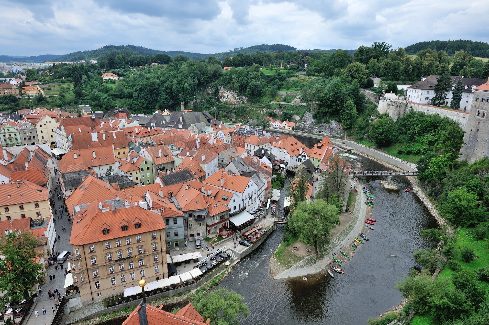 | チェスキー・クルムロフ城の塔からの眺め (13:32)「南東方向」MAP チェスキー・クルムロフ [Český Krumlov] の町並み。 |