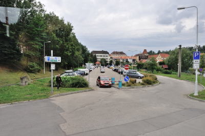 | 展望テラス (11:43)「東南東方向」MAP ホテル・リュゼ [Hotel Růže] の前に展望テラスがある。 皆さんが眺める左手方向に町並みが広がり、右手にホテル・リュゼがある。 (白い建物がホテル・リュゼ) |