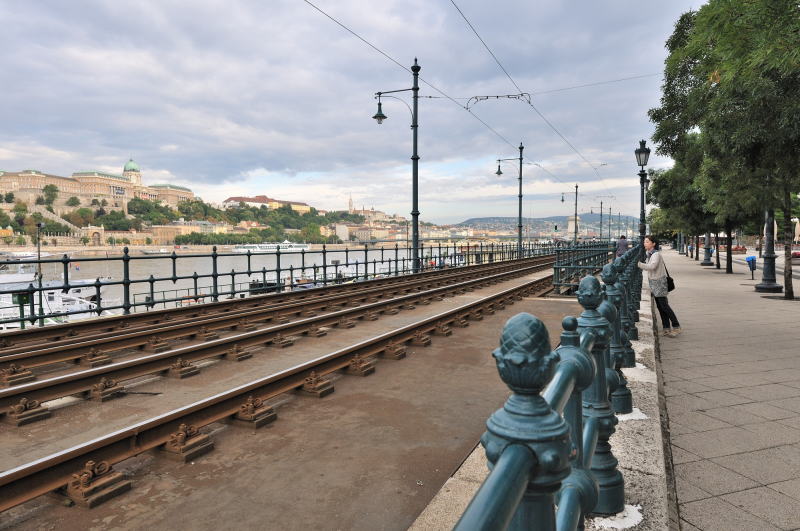 | ブダペストのドナウ川沿いを走るトラム [Villamos] の線路 (07:05)「北西方向」MAP ドナウ川の東岸 (ペスト側) を走るのは2号線 トラム [2-es villamos]、川向こうには "王宮の丘" [Várhegy] が見える。 |