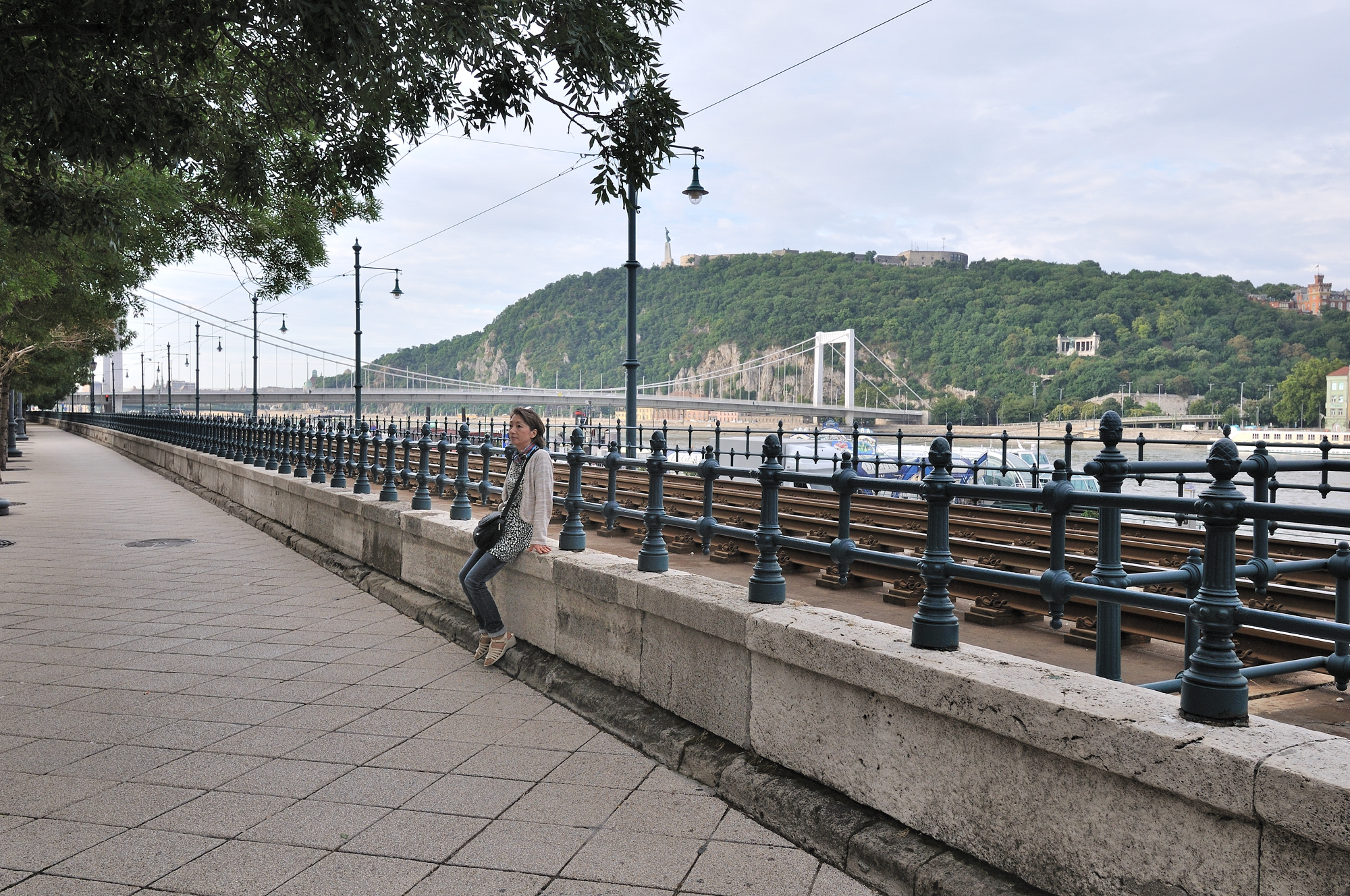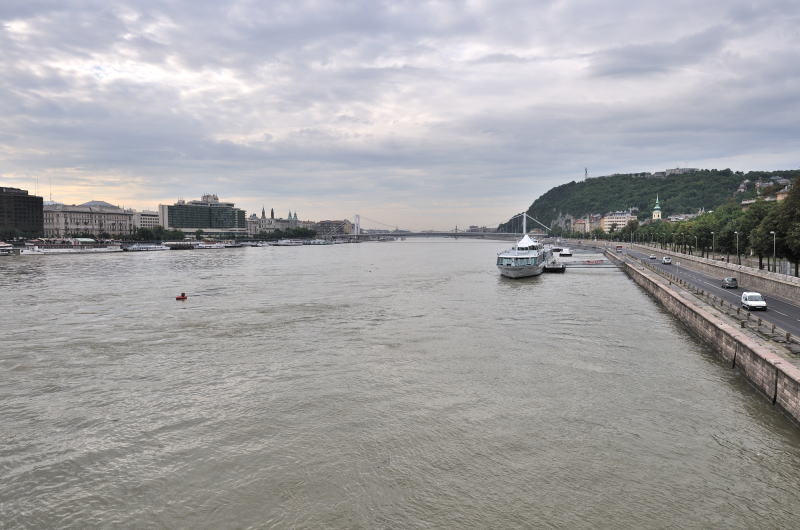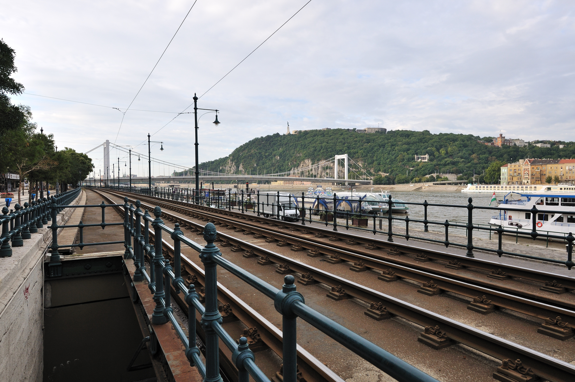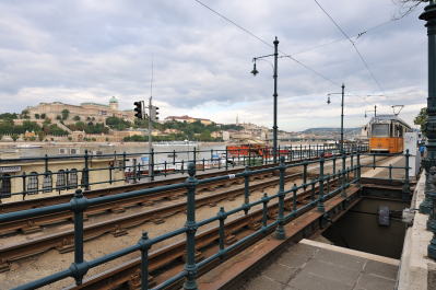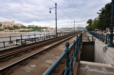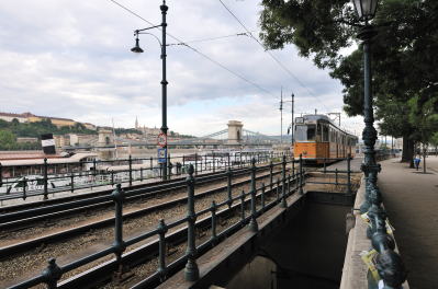 | ドナウ川の東岸沿いを走る2号線トラムの線路 (07:06)「南方向」MAP 川に架かる橋は "エルジェーベト (シシィ) 橋"、その後方の丘は "ゲッレールトの丘"。 |