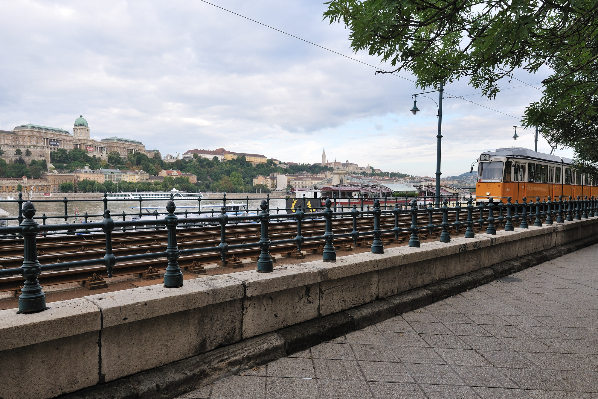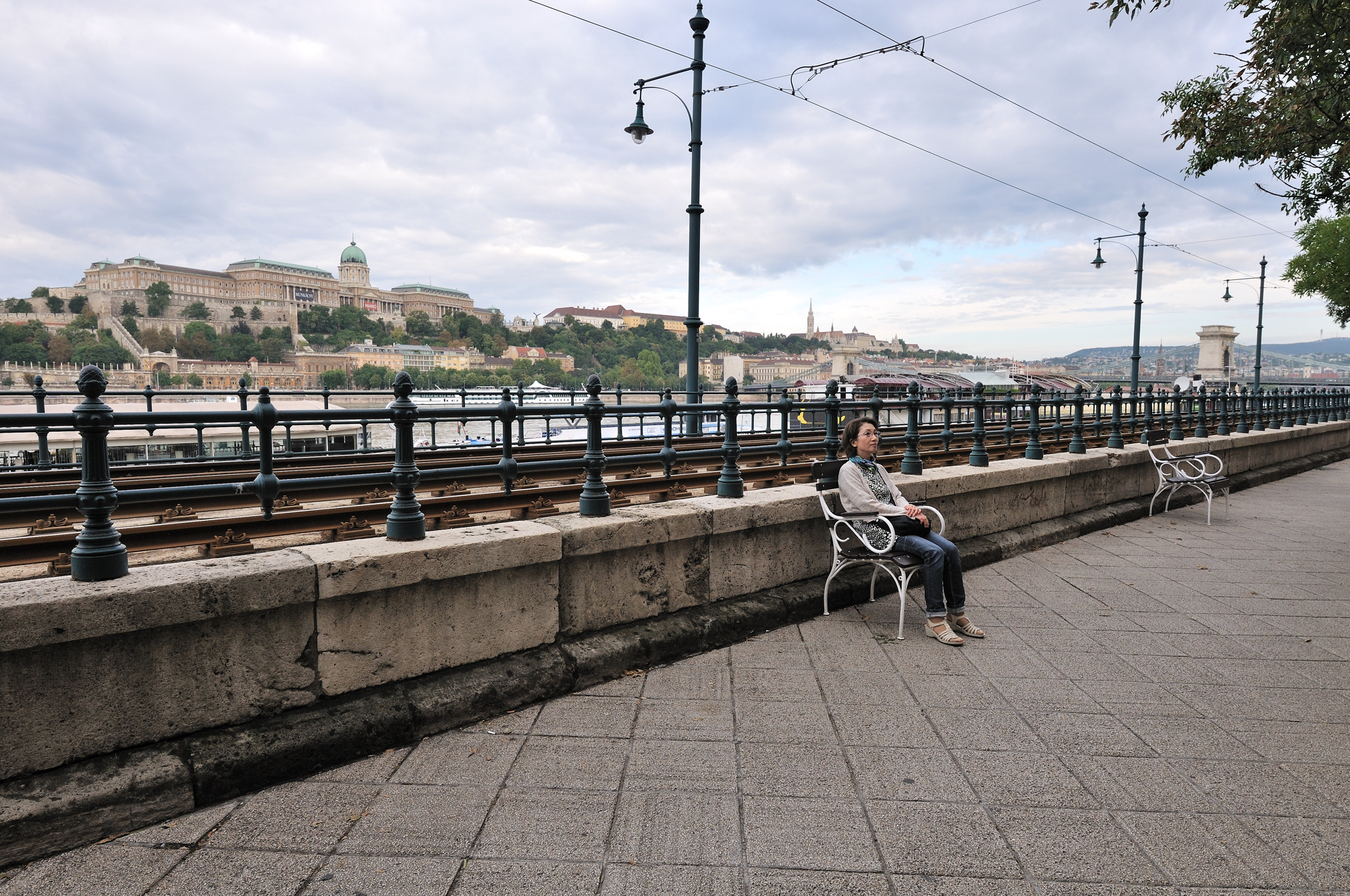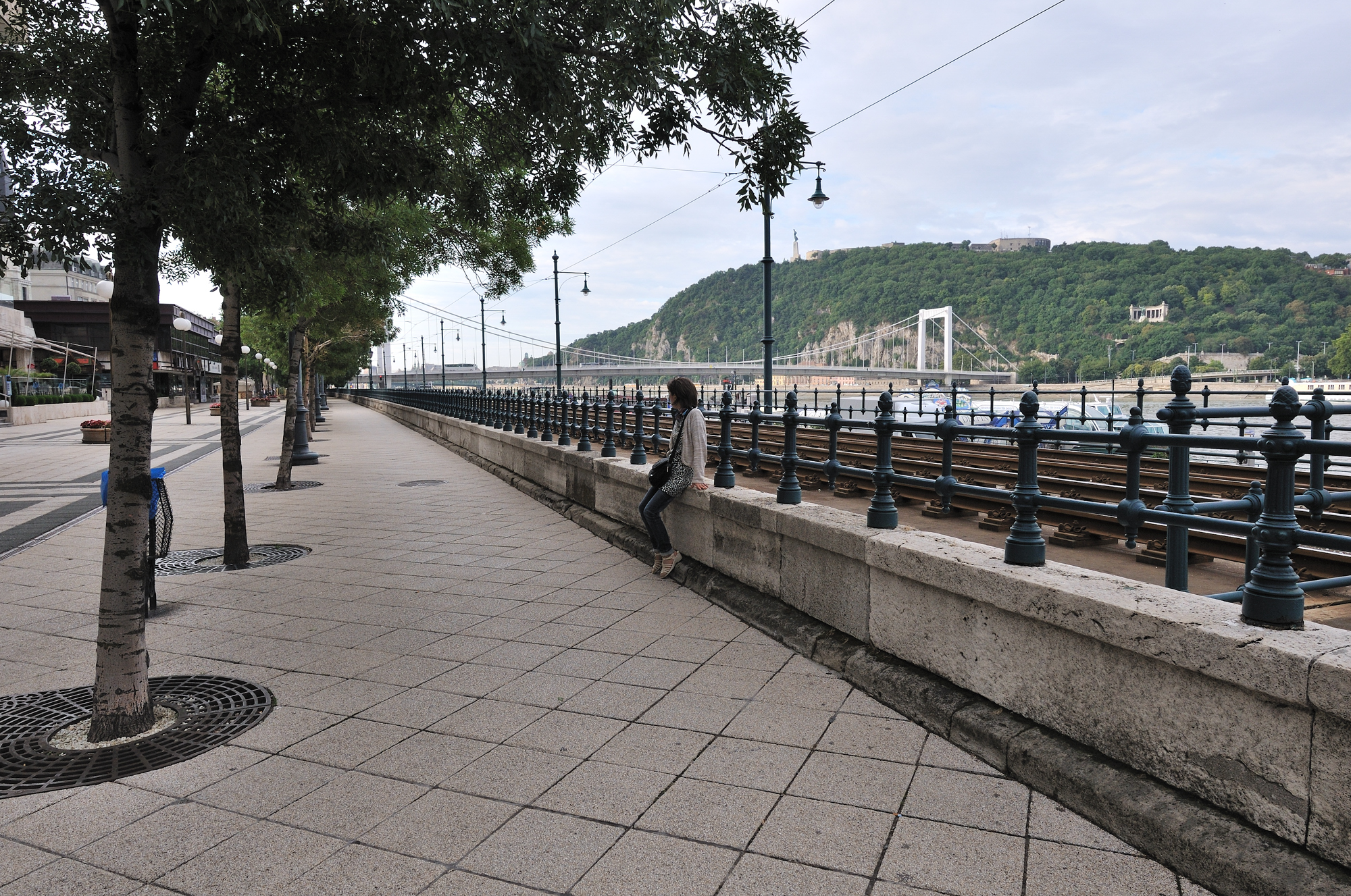 | ドナウ川の東岸沿いを走る2号線トラムの線路 (07:06)「南方向」MAP 川に架かる橋は "エルジェーベト (シシィ) 橋"、その後方の丘は "ゲッレールトの丘"。 |