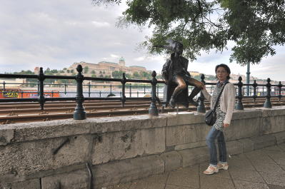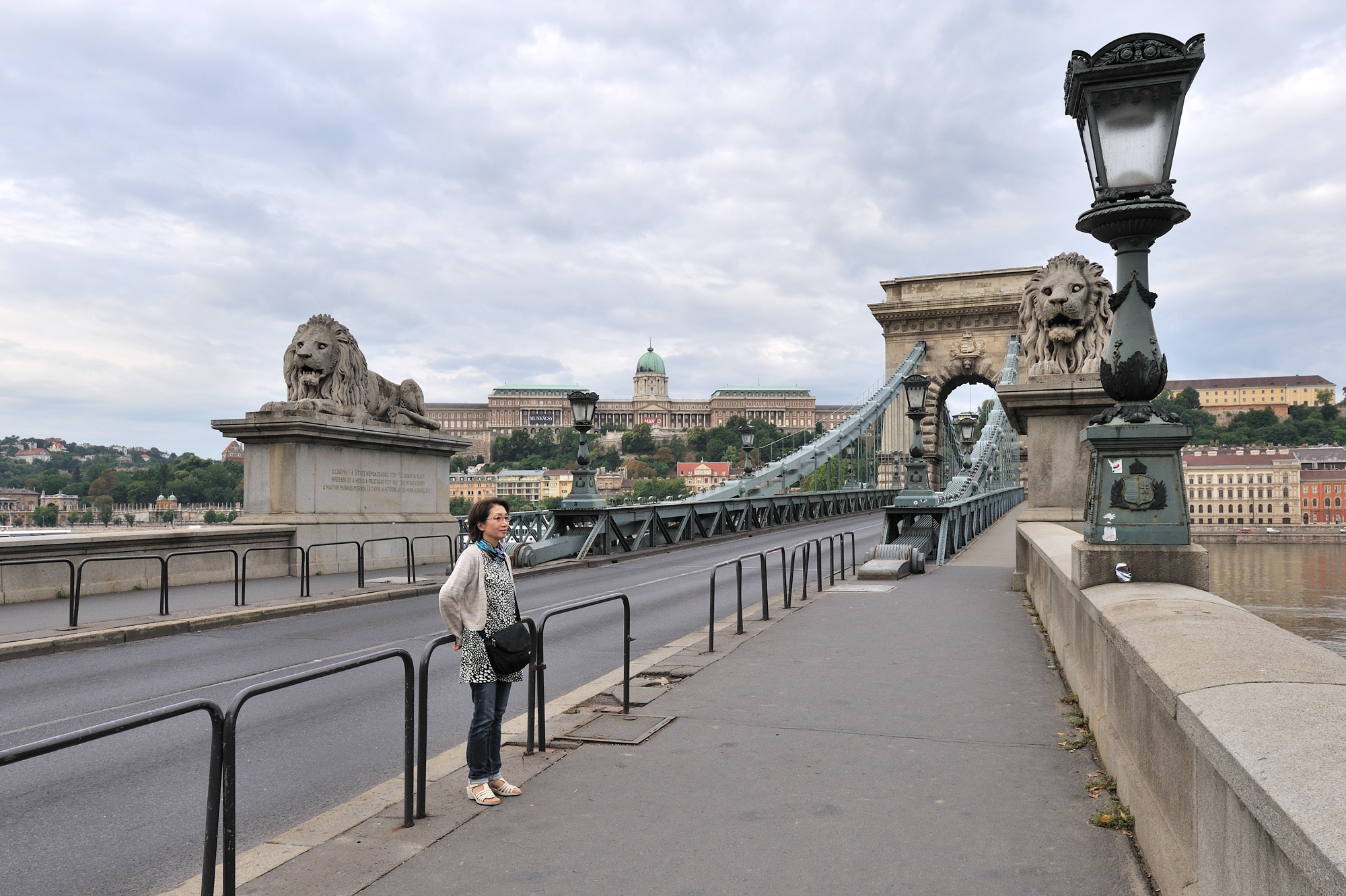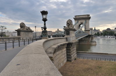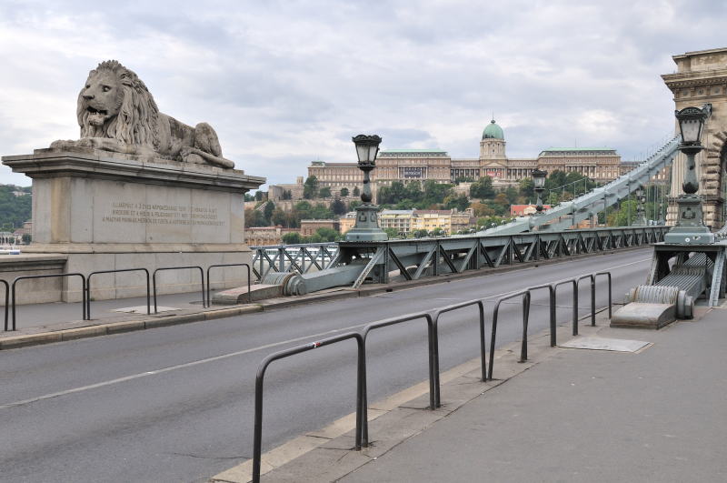 | セーチェーニ鎖橋 [Széchenyi Lánchíd] から王宮を望む (07:25)「南西方向」MAP この橋にある4頭のライオンの像はブダペストのシンボル的存在。 このライオン、口は開いているが舌が無いことから、彼らは歴史の証人であり、余計なことは喋るなということで舌が抜かれたという逸話がある。 しかし実際には、上から見ると舌はあるそうです。 |