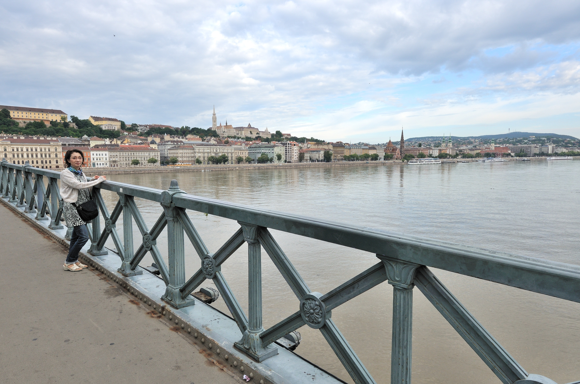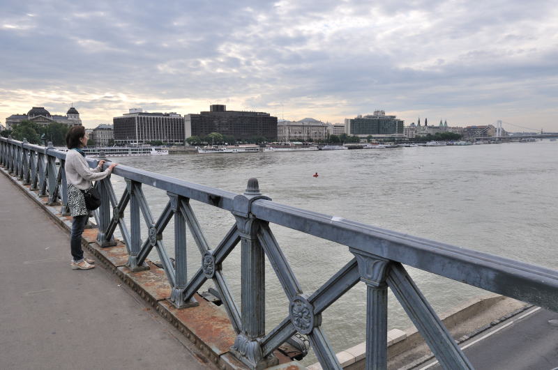 | くさり橋 [Széchenyi Lánchíd] (07:41)「東南東方向」MAP ブダ側からペスト(ペシュト)側を望む。 ペスト側にはドナウ川に面して多くのホテルが建ちならぶ。 |