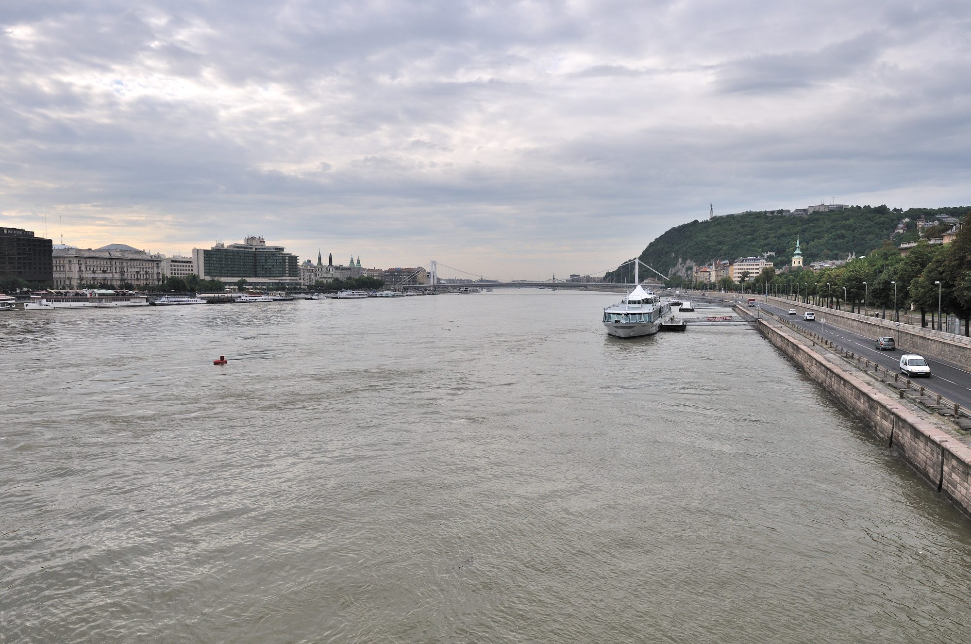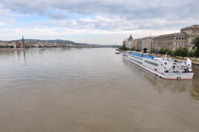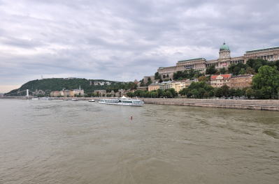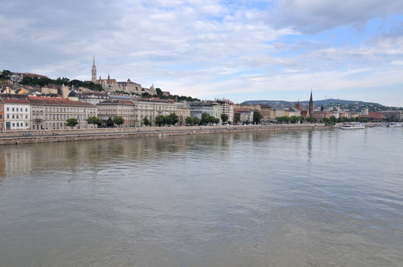 | くさり橋 [Széchenyi Lánchíd] からドナウ川の下流方向 (南方向) を望む (07:41)「南東方向」MAP 右岸に見える丘が "ゲッレールトの丘" [Gellért-hegy]、左岸には "マリオット・ブダペスト・ホテル" (宿泊ホテル) が見えている。 |