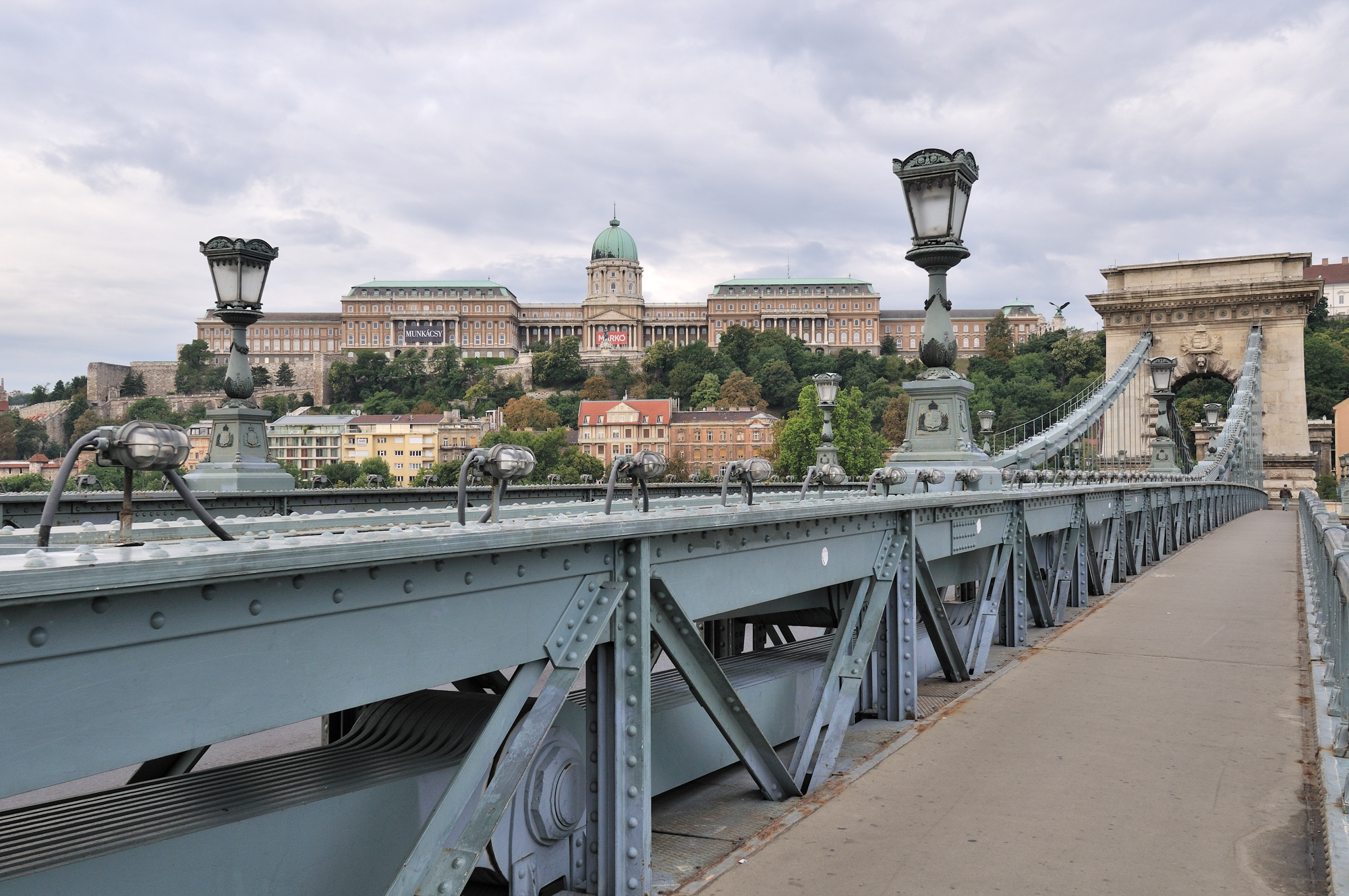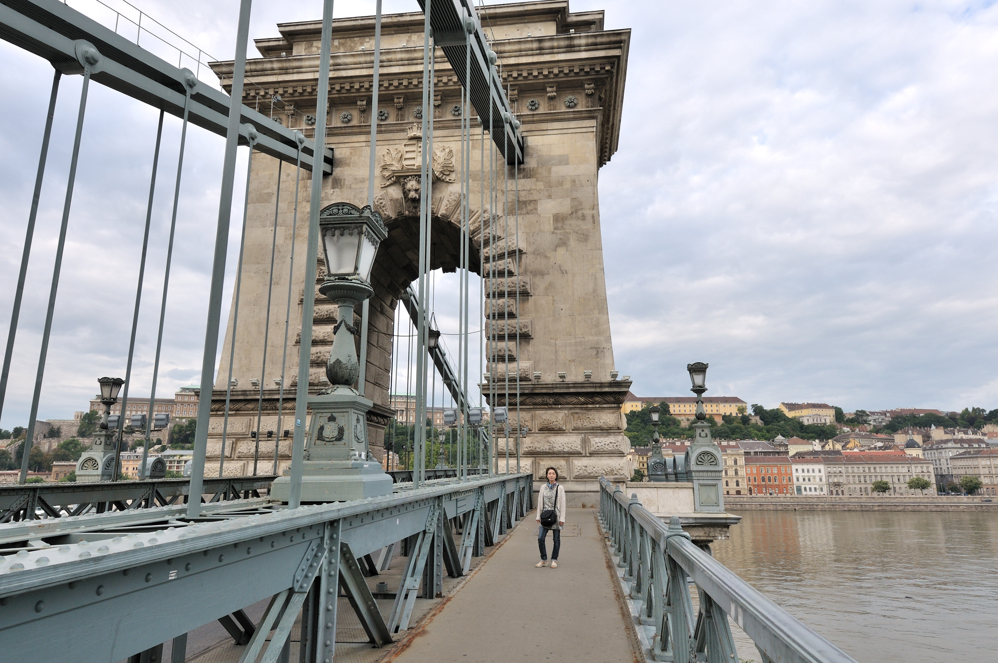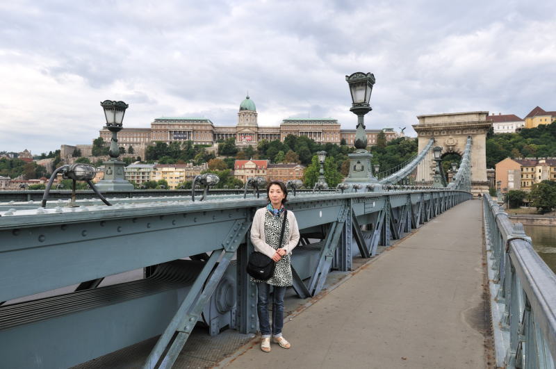 | くさり橋 [Széchenyi Lánchíd] から王宮を望む (07:30)「南西方向」MAP "くさり橋" はブダペストのドナウ川で最初に架かった常設橋で、西岸のブダ地区と東岸のペスト(ペシュト)地区を結んでいる。 この橋は鎖の技術を使って造られていることから "くさり橋" と呼ばれている。 写真をよく見ると、メインケーブルに自転車のチェーン (鎖) の構造によく似た アイバー・チェーン [Eyebar-chain] が用いられている。 構造上からEyebar-chain Bridgeに属し、正式名称は "セーチェーニ鎖橋" [Széchenyi Lánchíd] と呼ばれている。 |