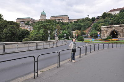 | くさり橋 [Széchenyi Lánchíd] から王宮の丘望む (07:31)「北西方向」MAP 左に見える尖塔のある建物は、マーチャーシュ教会 [Mátyás templom]で、そのドナウ川がわに "漁夫の砦" [Halászbástya] が建っている。 |
