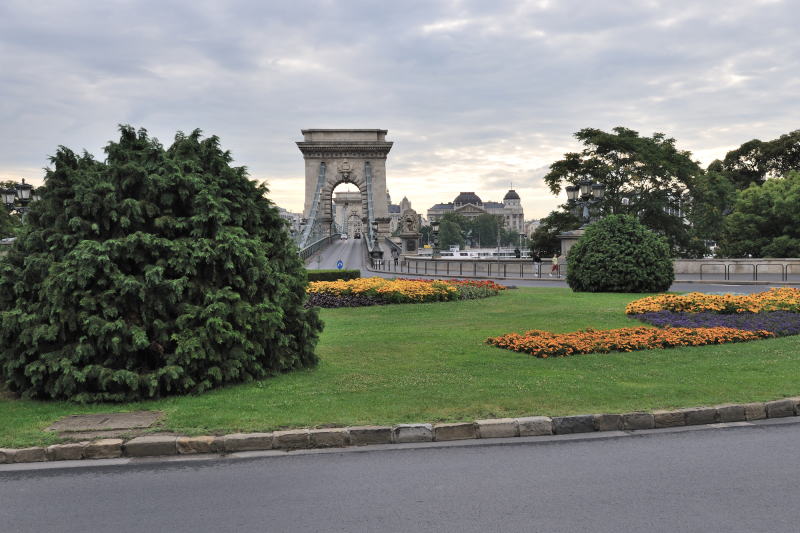 | ルーズヴェルト広場 [Roosevelt Tér] から "くさり橋" を望む (07:22)「西方向」MAP ルーズヴェルト広場 [Roosevelt Tér] は2011年5月12日付けで、ブダとペストを結ぶ "くさり橋" を架けたセーチェーニ伯爵の名前にちなみ、セーチェーニ・イシュトヴァーン広場 [Széchenyi István tér] に改名されている。 |
