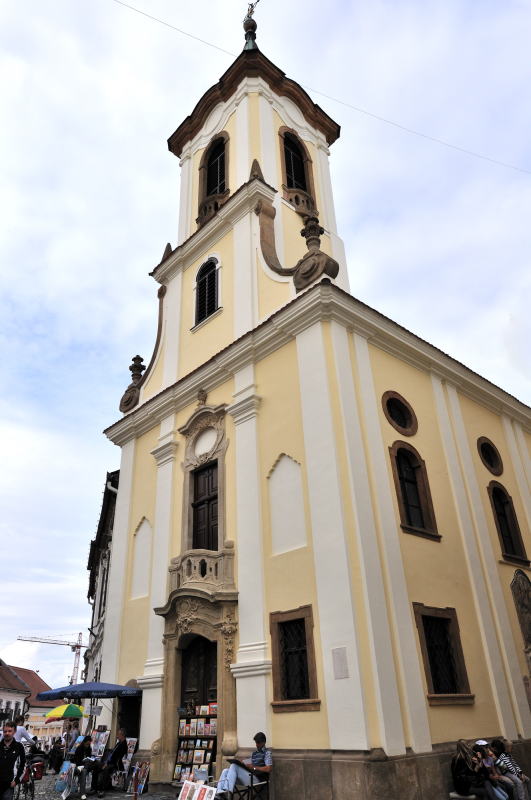 | ブラゴヴェシュテンスカ教会 [Blagovestenszka templom] (16:22)「北東方向」MAP 1754年、バロック様式の建築家アンドラーシュ・マイエルホファー [András Mayerhoffer] により創設されたセルビア正教の教会で、センテンドレを象徴する建物。 かつては男性用の南扉と女性用の西扉に分けられ、教会内でもイコン (聖画) によって信者席が男女別に仕切られていた。 また内部はカトリック教会と違い、立った状態でミサが行われていたため椅子は無く、がらんとした状態だった。 現在は展示・博物館として使用されている。 |