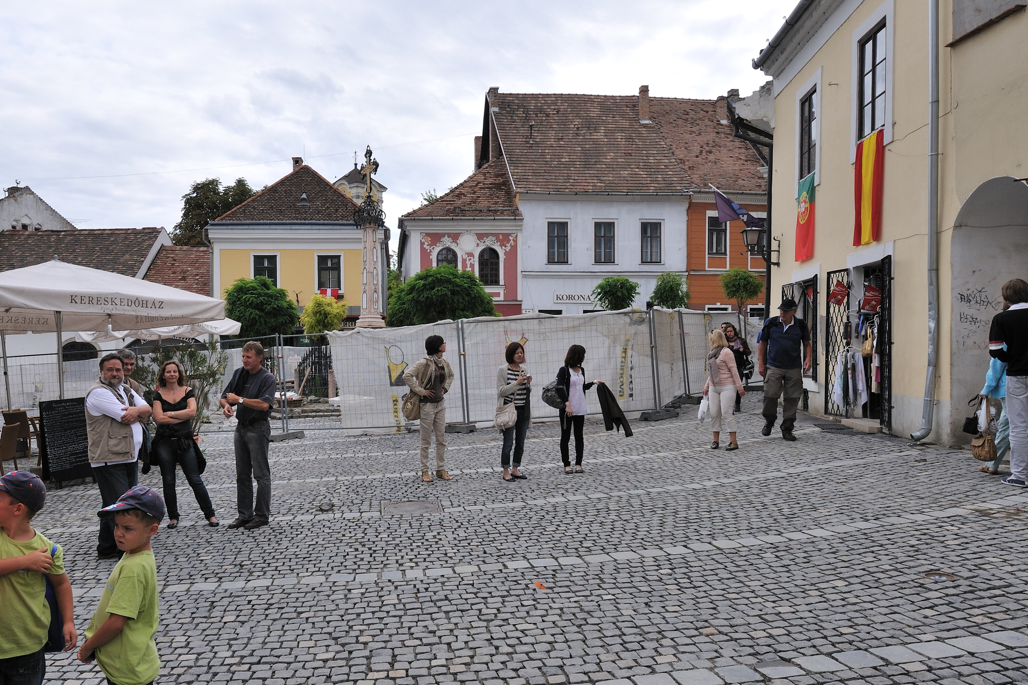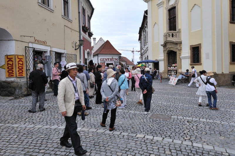 | 中央広場 [Főtér] (16:22)「北北東方向」MAP 中央広場は三角形で、三角形の広場を持つ唯一の町になっている。 ちなみに左端に見える黄色の看板 "LANGOS" (ランゴス) はハンガリー人の "おやつ"で 「揚げパン」 のこと。 |