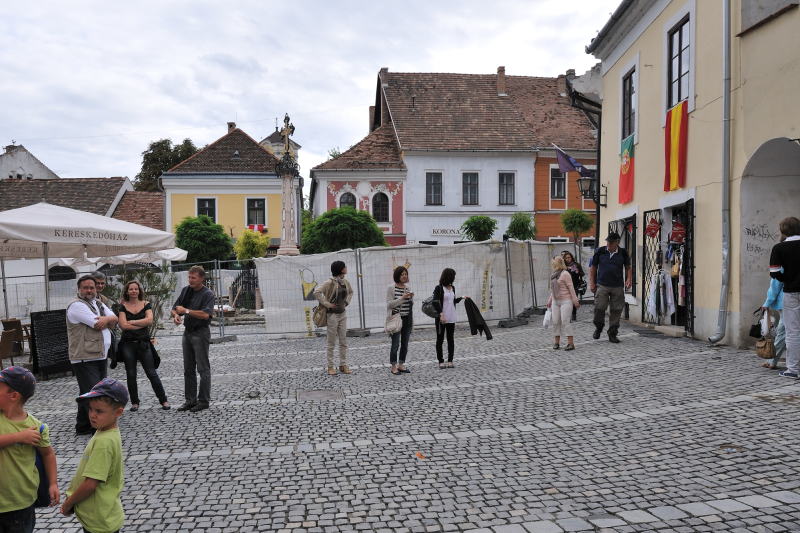 | 中央広場 [Főtér] (16:35)「南南西方向」MAP 工事中でよく見えないが、中央やや左に三位一体の像がある。 これはマーチャーシュ教会の隣にあった三位一体の像とは違い、セルビア正教会が造った記念碑で聖人は全て絵で描かれている。 この記念碑の下にはペスト菌の復活阻止を願い、ペストで亡くなったセルビア商人の遺体が逆さに (倒立した状態) 埋められていると言われる。 セルビアの商人たちはドナウ川を交通路として、塩の売買で生計を立てていた。 |