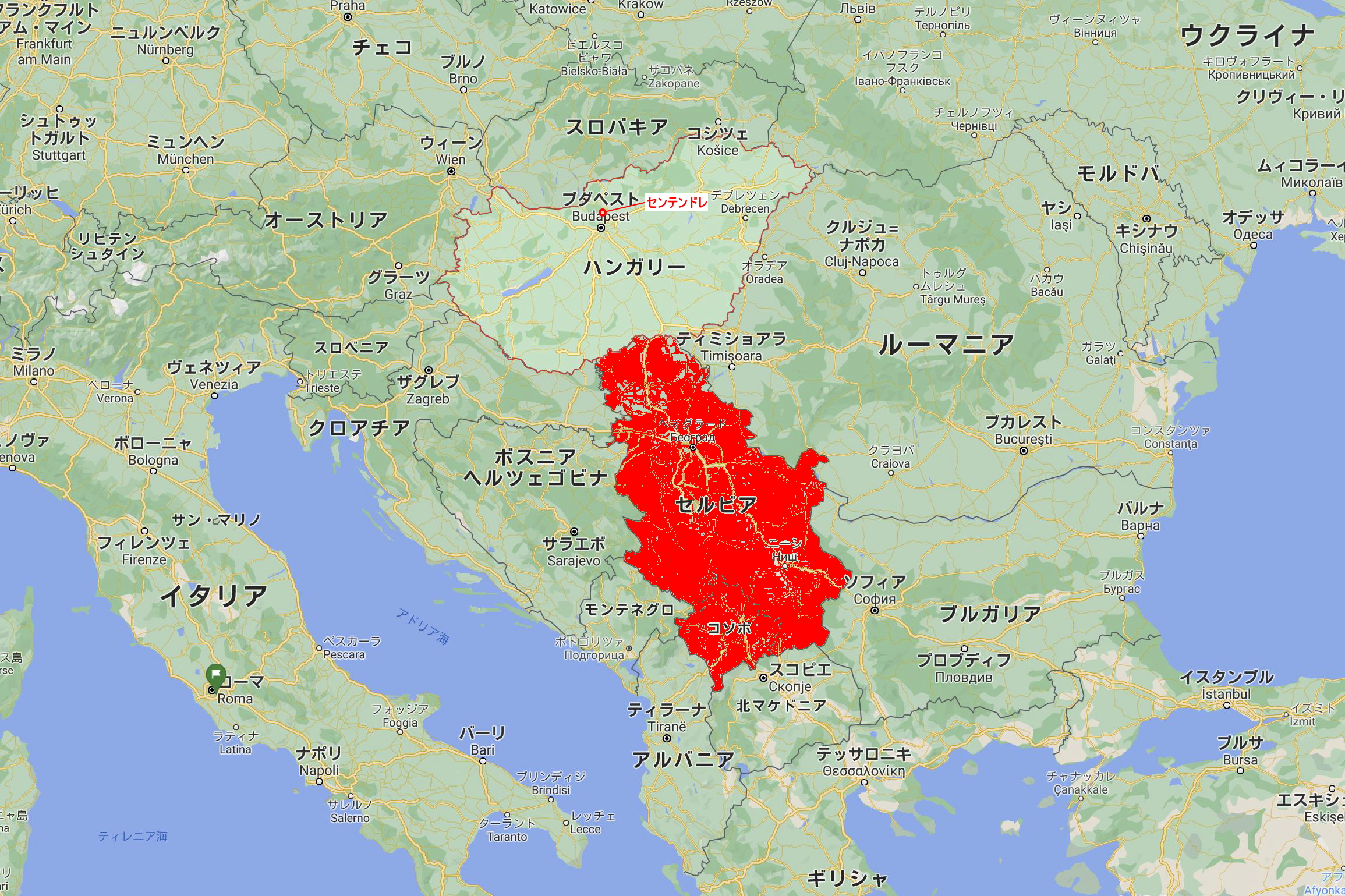 | センテンドレ ( ハンガリー) とセルビアの位置関係。 |