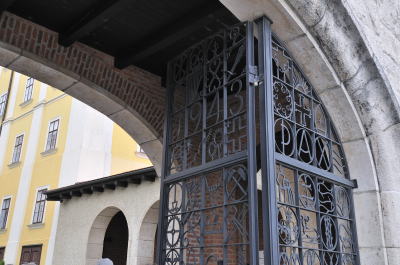 | 正面ゲートの鉄扉 (10:51) 左扉には "996~" の文字が記されており、右扉には "1943" の文字が記されている。 これは、996年に修道院が創設され、このゲートが完成したのが1943年であることを示している。 |