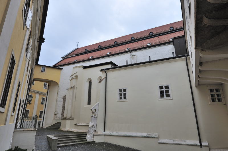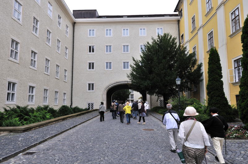 | 教会と修道院に囲まれた中庭 (11:41)「東方向」MAP 黄色のバロック様式の建物は修道院で、右の白い建物は教会。 |