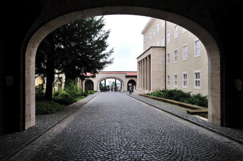 | 修道院の中にある図書館 (古文書館) へ向かう (11:41)「北北西方向」MAP 左手には古い時代の建物の一部が展示されており、その前方に図書館の入口がある。 |