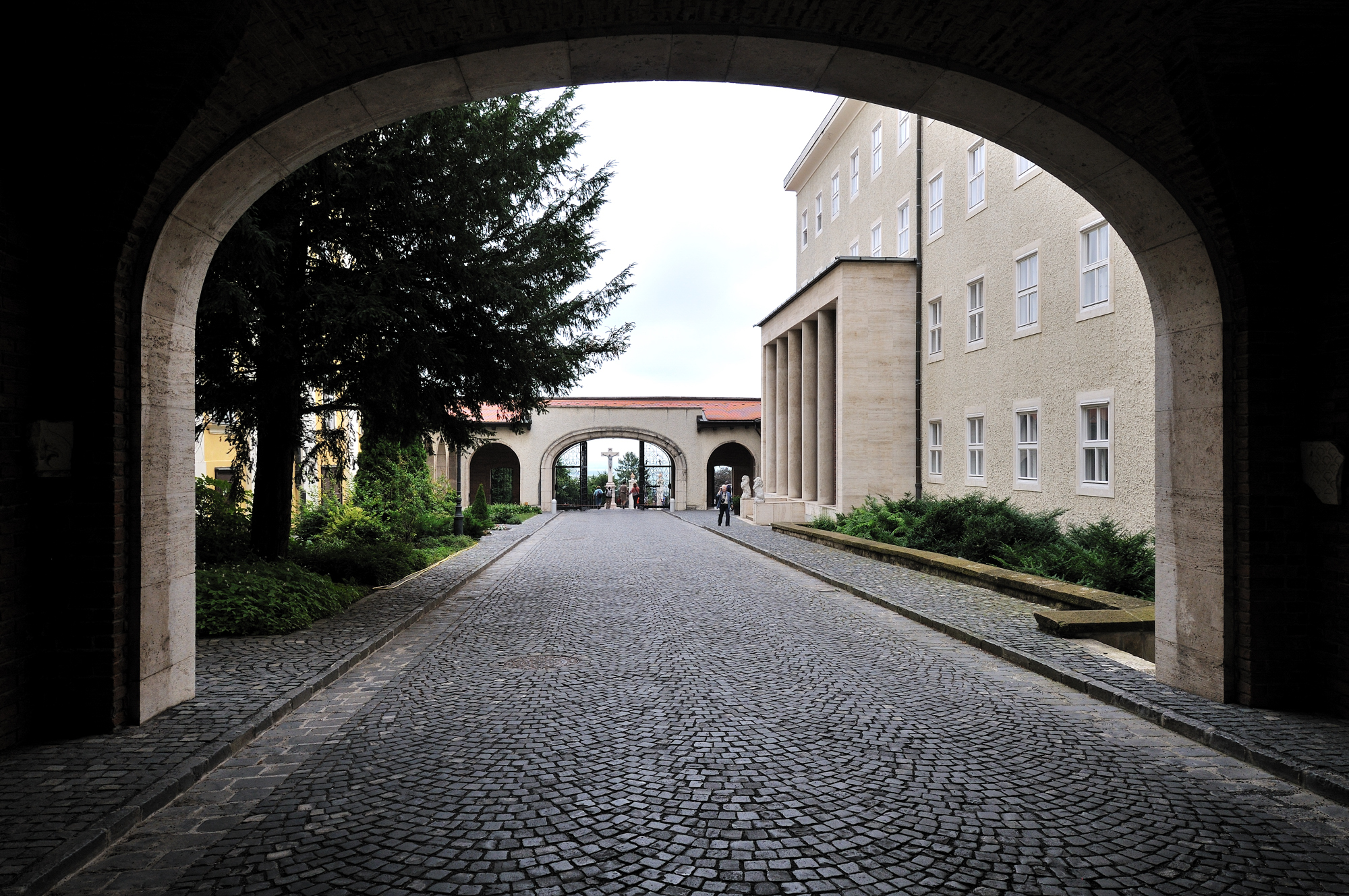 | パンノンハルマ修道院の正面ゲート (10:52)「東北東方向」MAP 修道院の敷地内部から正面ゲート方向を望む。 右手に見える建物が修道院付属の学校とその寄宿舎で、現在約300人の学生が学んでいる。 |