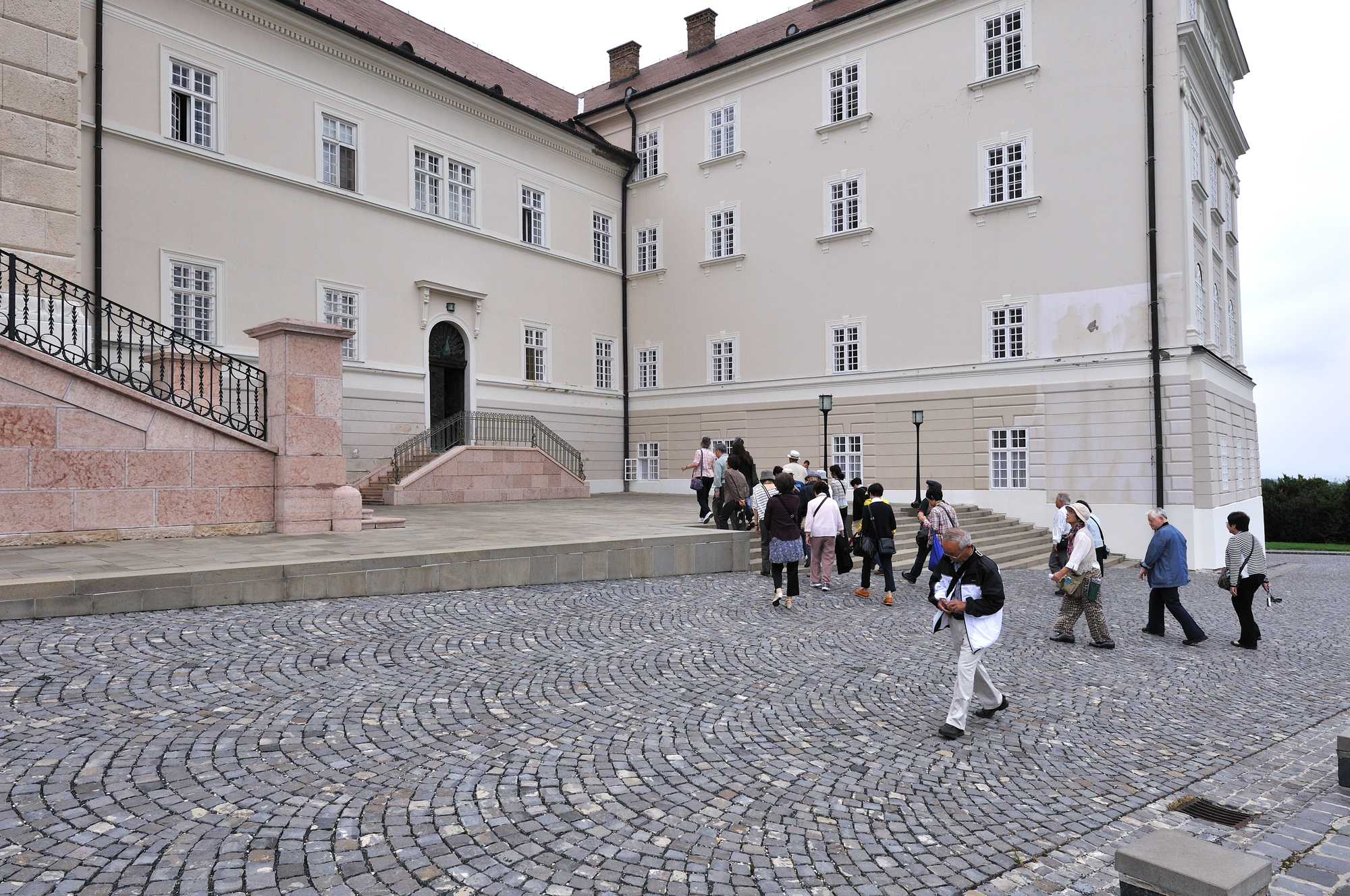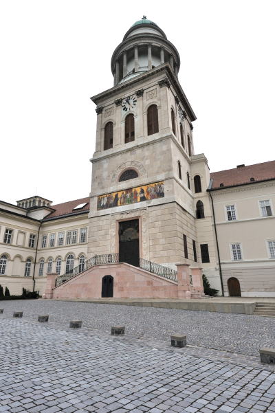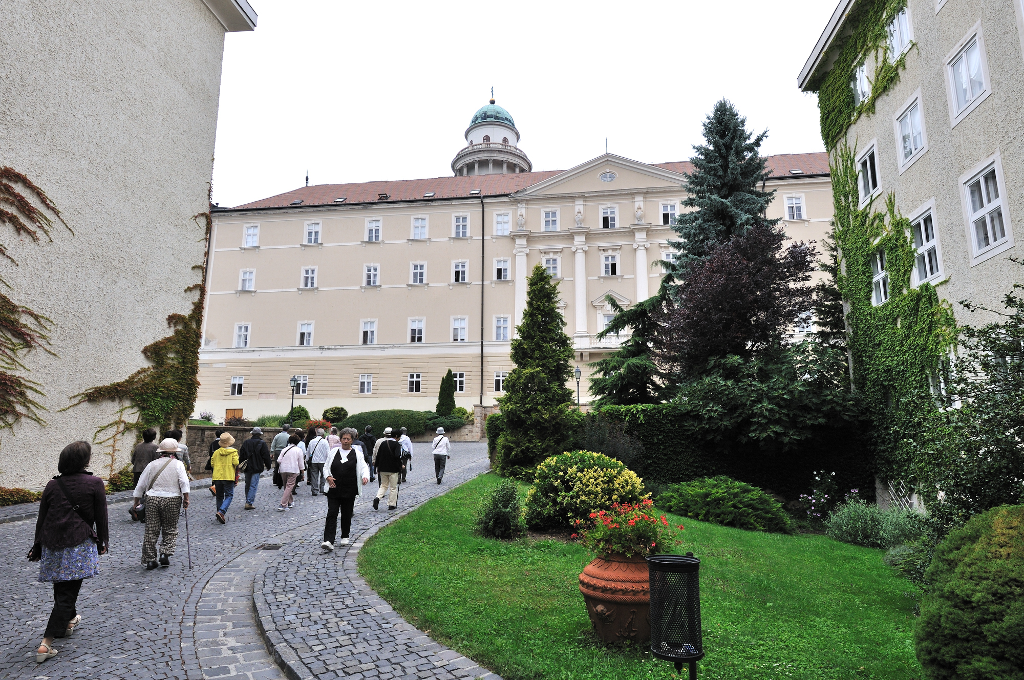 | パンノンハルマ修道院 [Pannonhalmi Főapátság] (10:30)「東方向」MAP 1996年12月にユネスコの世界遺産に登録されたパンノンハルマ修道院は清貧と貞潔を旨としたベネディクト派らしく、人里離れた海抜282mの聖マールトン [Szent Márton]* の丘に立っている。 * 聖マールトン [Szent Márton] はハンガリー語、ラテン語では聖マルティヌス [Sanctus Martinus]、英語では聖マールティン [Saint Martin] 。 伝統によれば、マールトンは316年または317年にパンノンハルマの城の丘の隣で生まれたと伝えられ、殉教をせずに列聖されたヨーロッパ初の聖人で、ハンガリーの守護聖人でもある。 |