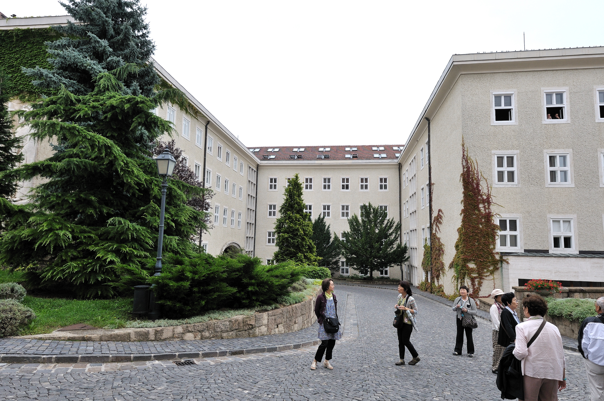| 黄色のバロック様式の建物 (10:54)「東方向」MAP 1002年にハンガリーの初代国王であるイシュトヴァーンによって修道院の設立が正式に認められ、ハンガリーで最初のキリスト教の修道院になった。 その後キリスト教を布教するためにいろいろな活動を進めていたが、1526年のオスマントルコ軍団による襲撃で、この地もオスマントルコの支配下に納められてしまう。 オスマントルコはイスラム教徒であることから修道院の活動は禁止され、また多くの建物も破壊された。 オスマントルコによる支配は約150年にわたり続いたが、そのご支配力は徐々に低下し、最終的にオスマントルコによる支配から逃れられたのは18世紀に入ってからである。 18世紀には破壊された建物の修復や改築が大々的に行われ、この黄色のバロック様式の建物はそのとき増改築されたものである。 この建物は、修道士の人達が生活している建物で、現在約40人の修道士たちが生活している。 多くある仕事の中で修道士にとって最も大切なものは、教鞭を執ること、つまり教師になることで、宗教的な知識のみではなく、物理、数学、国語、第二外国語など多岐にわたる知識が必要とされている。 |