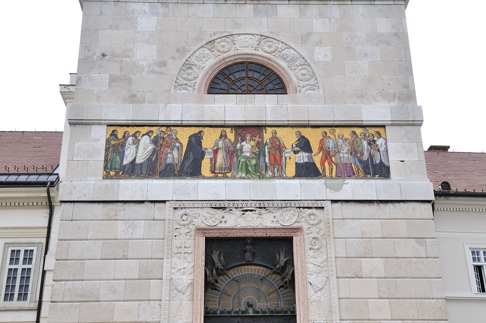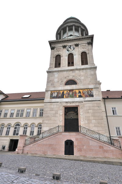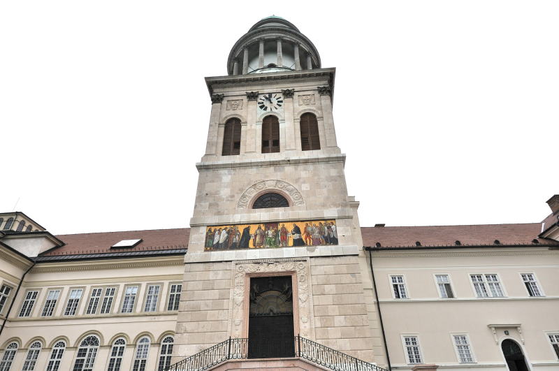 | 修道院の時計塔に施されたモザイク画 (11:01)「東北東方向」MAP 正面入口の上には綺麗なモザイク画があり、その中央には十字架を持った女性が椅子に座っている。 この女性は聖母マリアさまだと言う人や、ただ単にカトリックを象徴する女性だと言う人がいて、真偽のほどは定かではありません。 向かって女性の左にいる紫色のマントを羽織った男性は初代国王の聖イシュトヴァーンで、右手に持った証書 (1002年、修道院の設立を正式に認める証書) をお付きの者に渡している。 女性の右にいる赤い服を着てグリーン色のマントを羽織った男性はオーストリア皇帝フランツ1世 (ヨーゼフ2世の甥) で、神聖ローマ帝国ヨーゼフ2世の修道院廃止令によって1786年に閉鎖されたこの修道院に対し、1802年に再興許可が与えられる様子を示している。 ちなみに、再興された1802年に国の認可を受けたギムナジウムが創設され、ここからハンガリーの教育史が始まる。 |