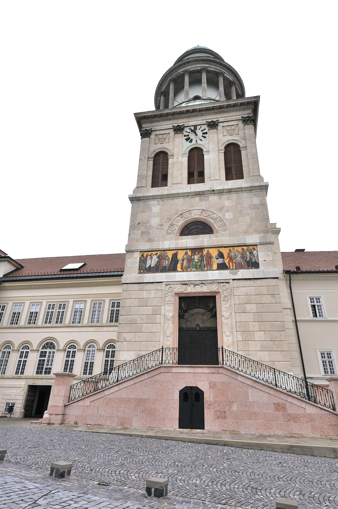 | 修道院の時計塔 (11:00)「東北東方向」MAP 19世紀にヤーノシュ・パックによって建てられた時計塔 (高さ55m) で、修道院のシンボルとなっている。 下にある扉は教会の正面入口。 通常は向かって右に見えるアーチ状の入口が使用される。 |