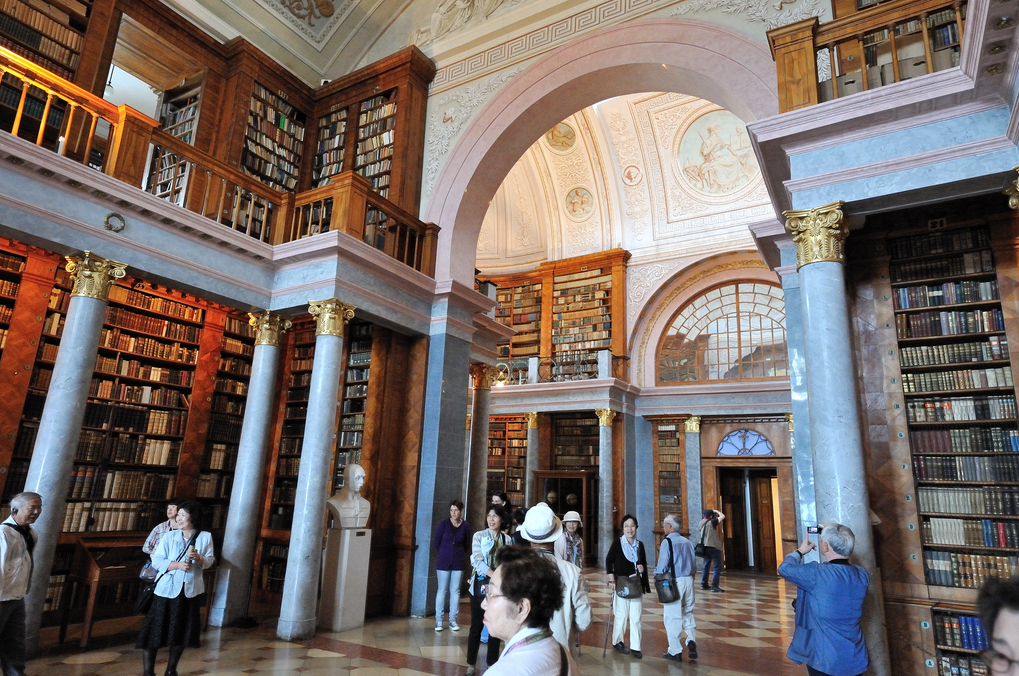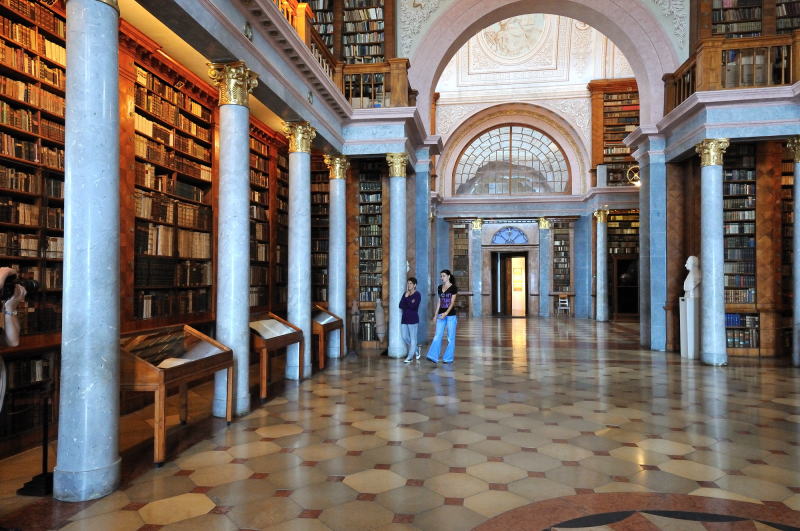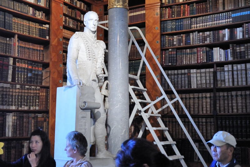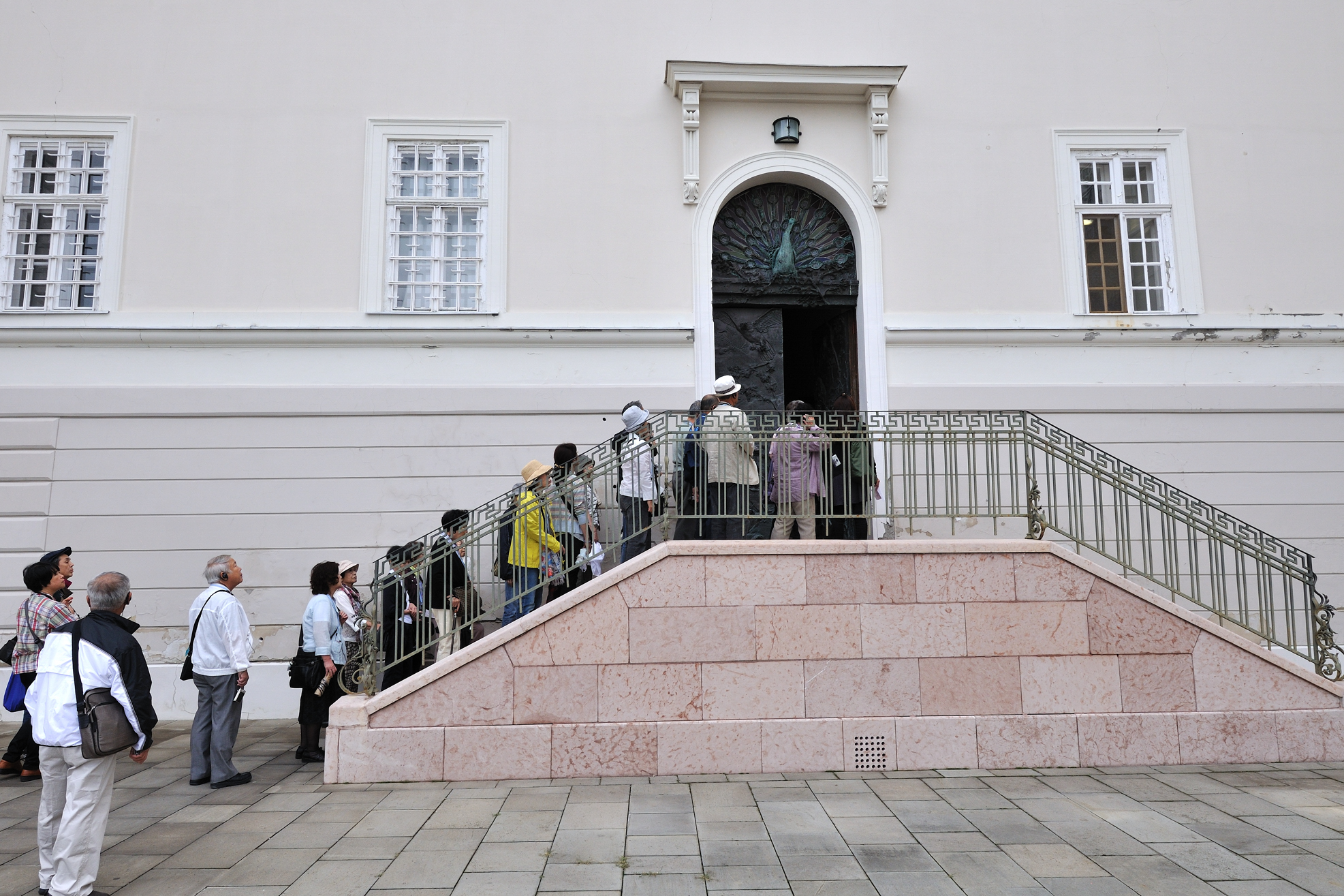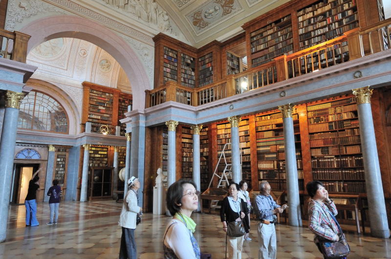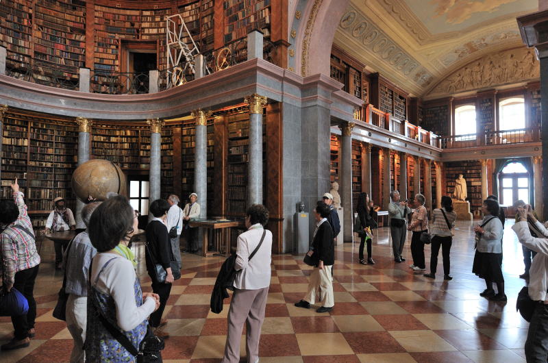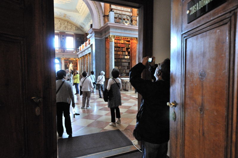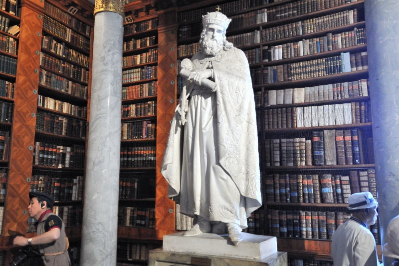 この立派な図書館は単なるディスプレーではなく、一般の図書館と同様、ハンガリー国民であれば誰でも本を借りることが出来る。 ただし、ここに来て自分で好きな本を選ぶのではなく、図書館専門の事務所に行って、希望の本を申し込めば係の人がここから本を届けてくれるシステムになっている。(歴史的に貴重な本については研究者のみに限られている。) |