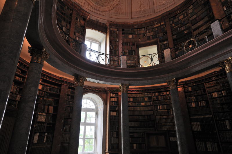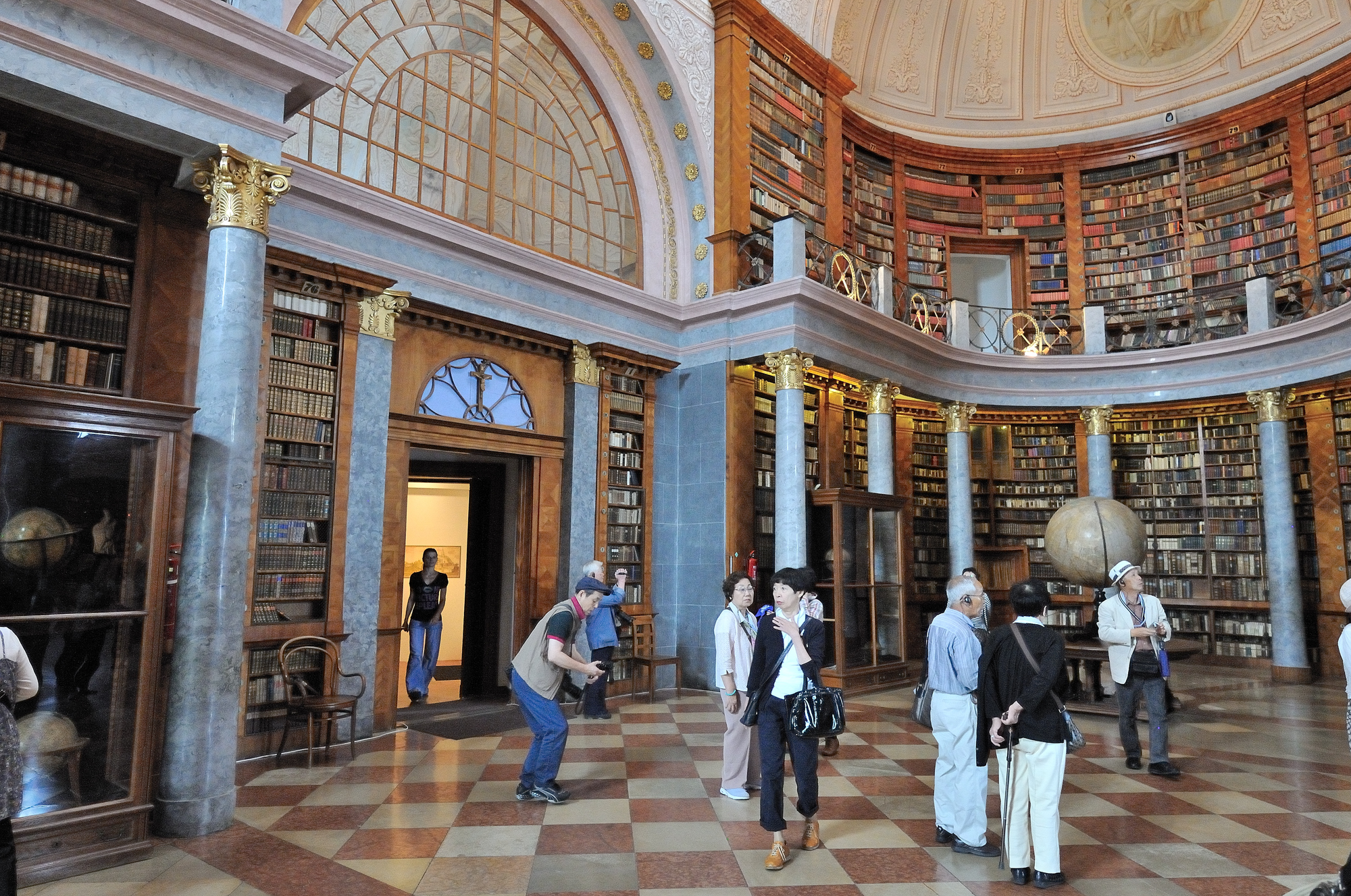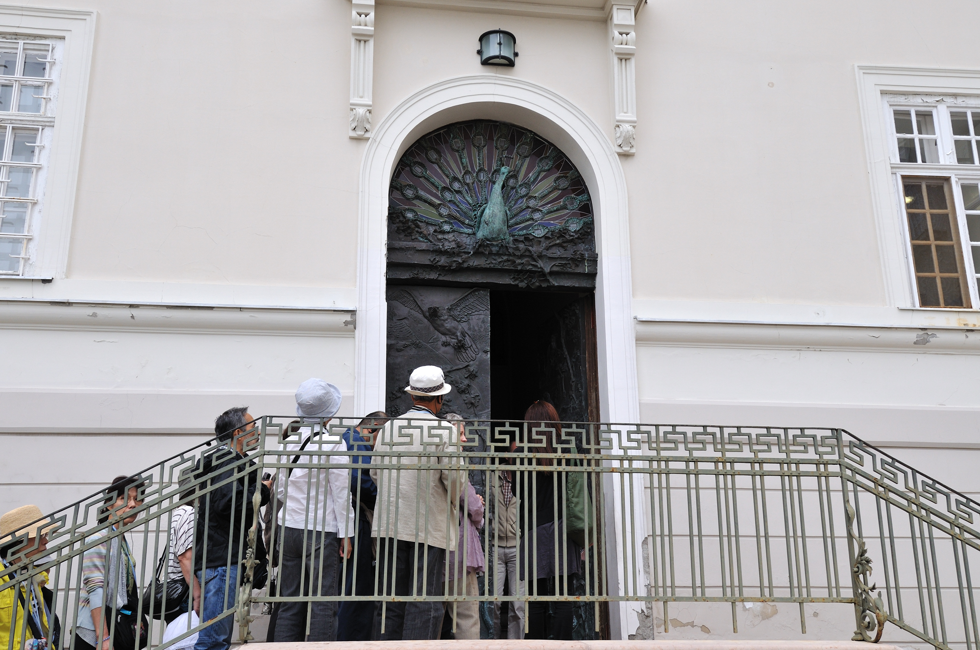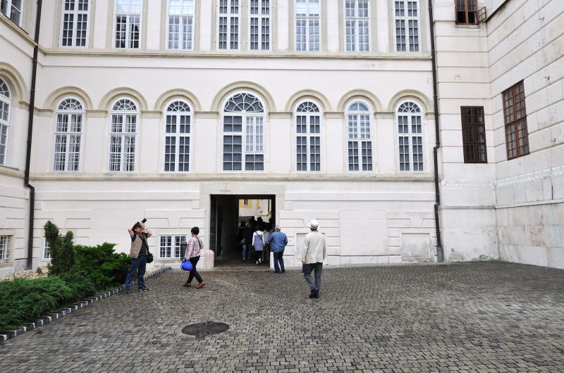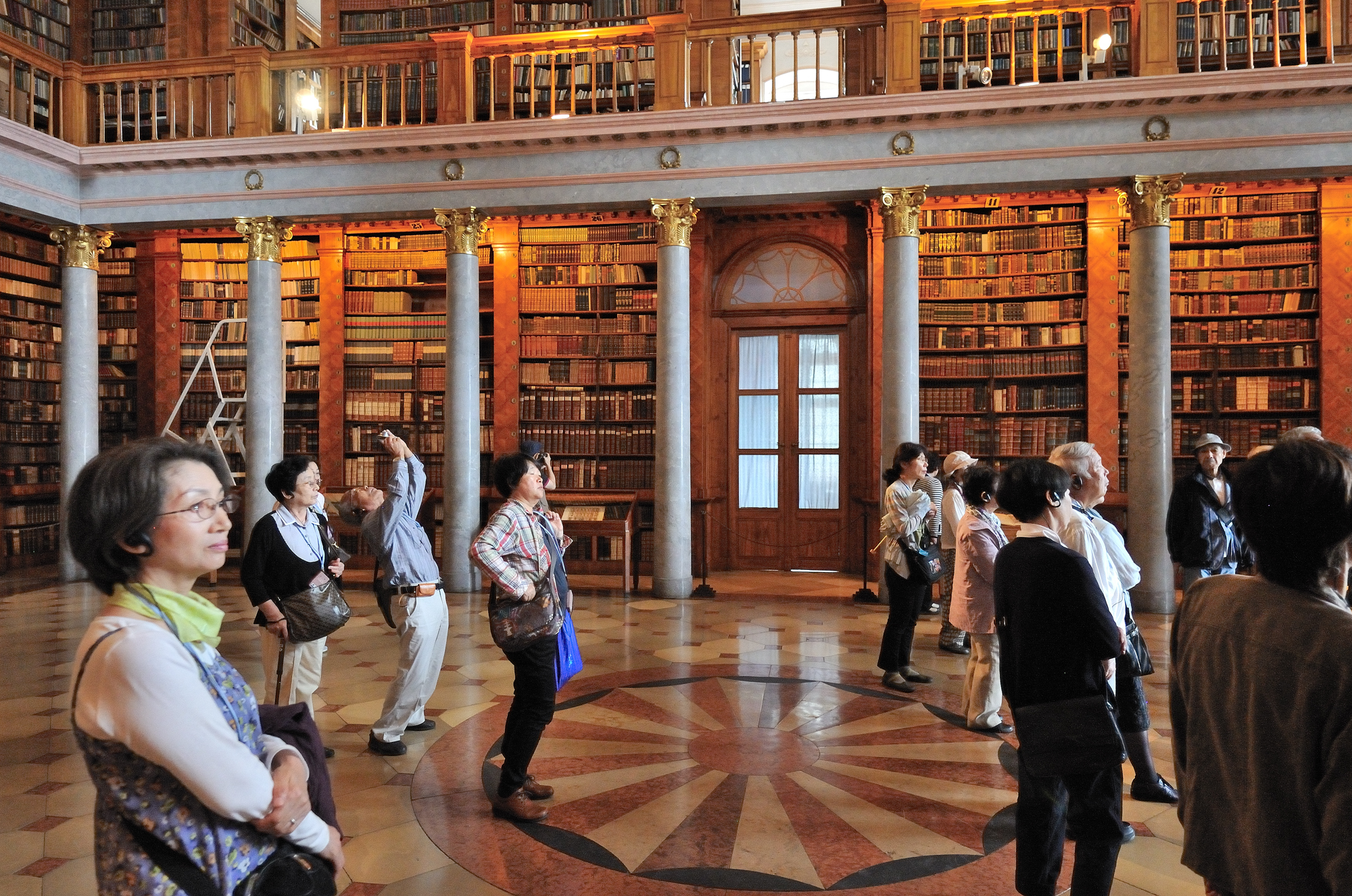 この立派な図書館は単なるディスプレーではなく、一般の図書館と同様、ハンガリー国民であれば誰でも本を借りることが出来る。 ただし、ここに来て自分で好きな本を選ぶのではなく、図書館専門の事務所に行って、希望の本を申し込めば係の人がここから本を届けてくれるシステムになっている。(歴史的に貴重な本については研究者のみに限られている。) |
