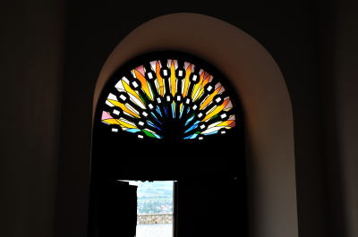 右のステンドグラスは、初代国王の聖イシュトヴァーンが跪いて、ハンガリーの守護聖人であるマリアさまに王冠を捧げる場面を描いている。 聖イシュトヴァーンの名は、石打の刑で殉教したキリスト教徒の名前で、この名を洗礼名として授けられた。 初代国王のイシュトヴァーンはキリスト教の布教に大変貢献したため、死後、列聖されている。 ちなみに、洗礼前のイシュトヴァーンの名前はヴァイク [Vajk] 。 |