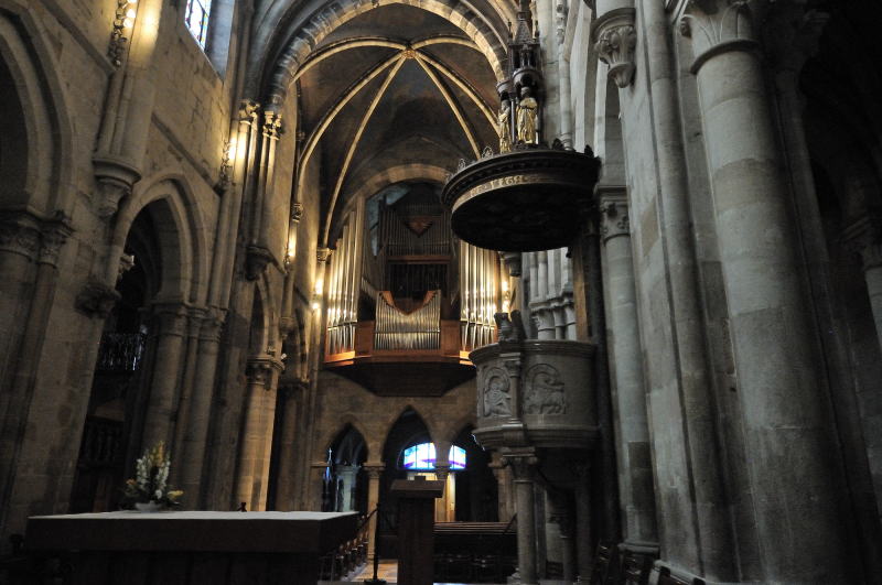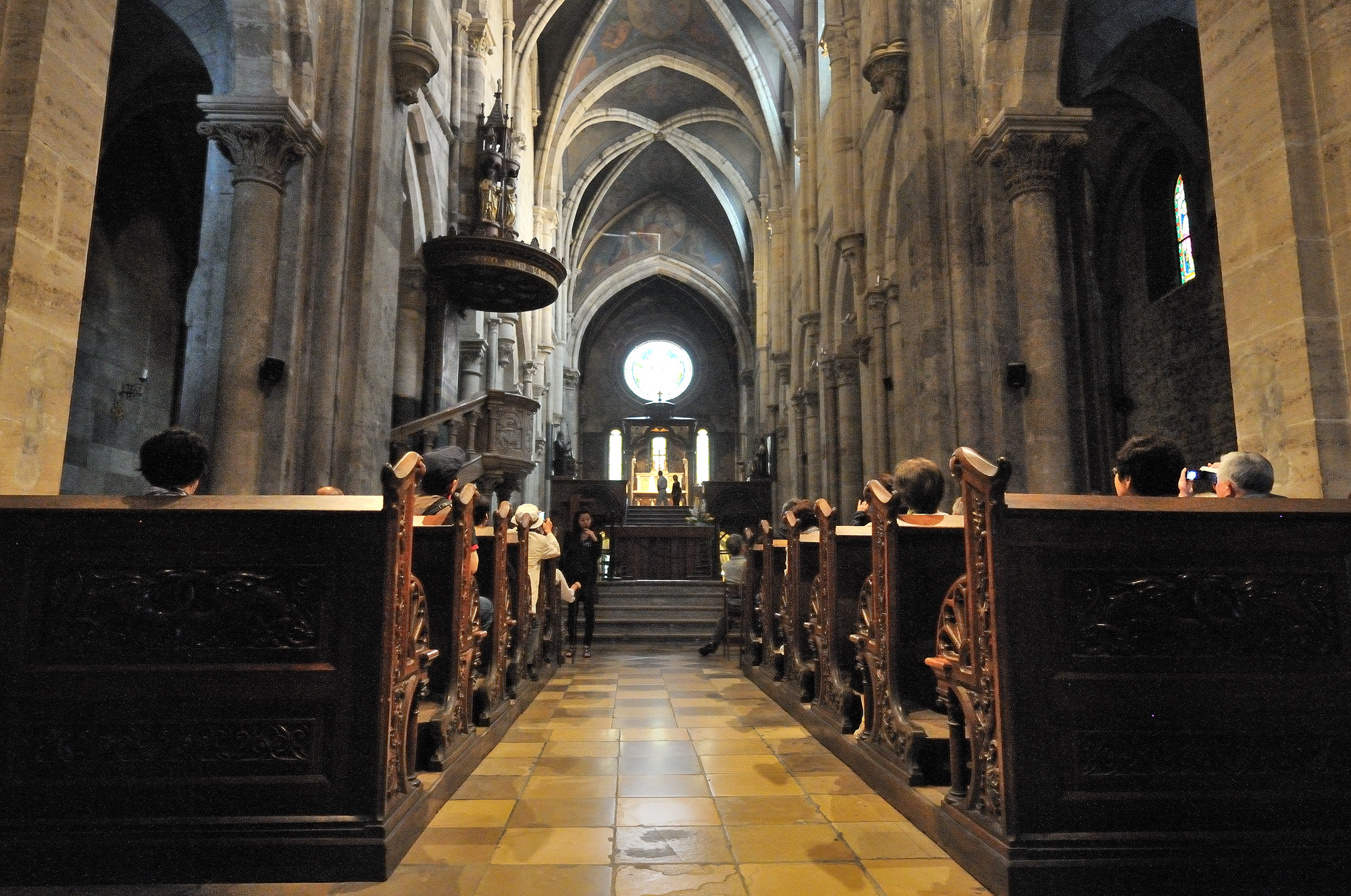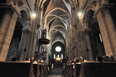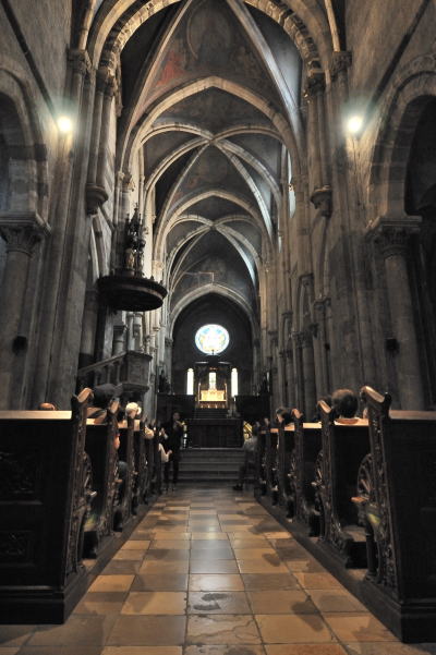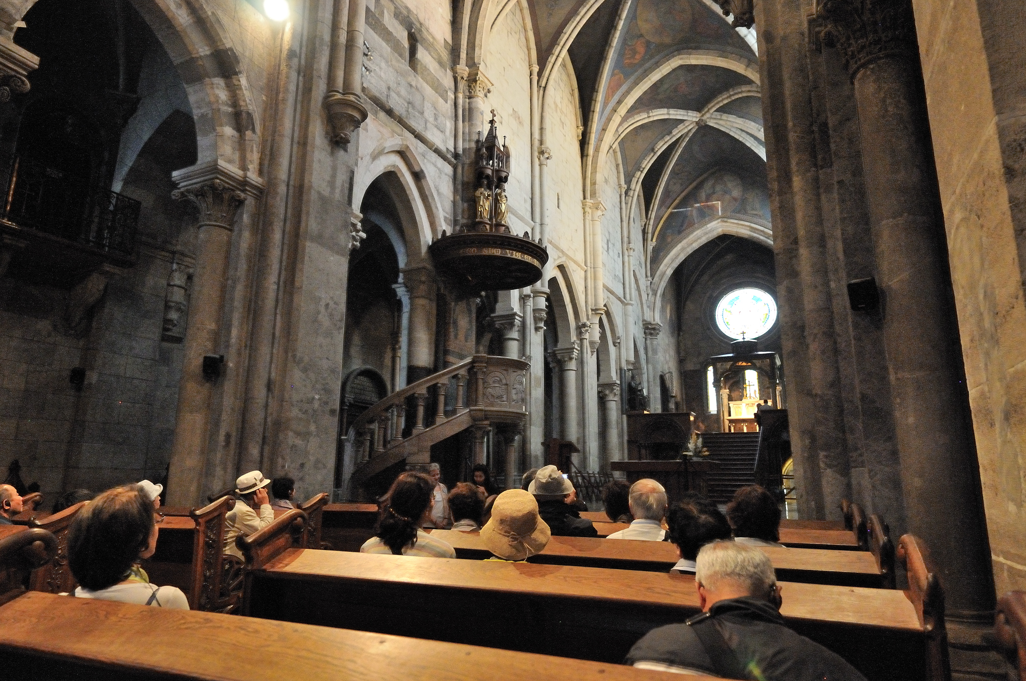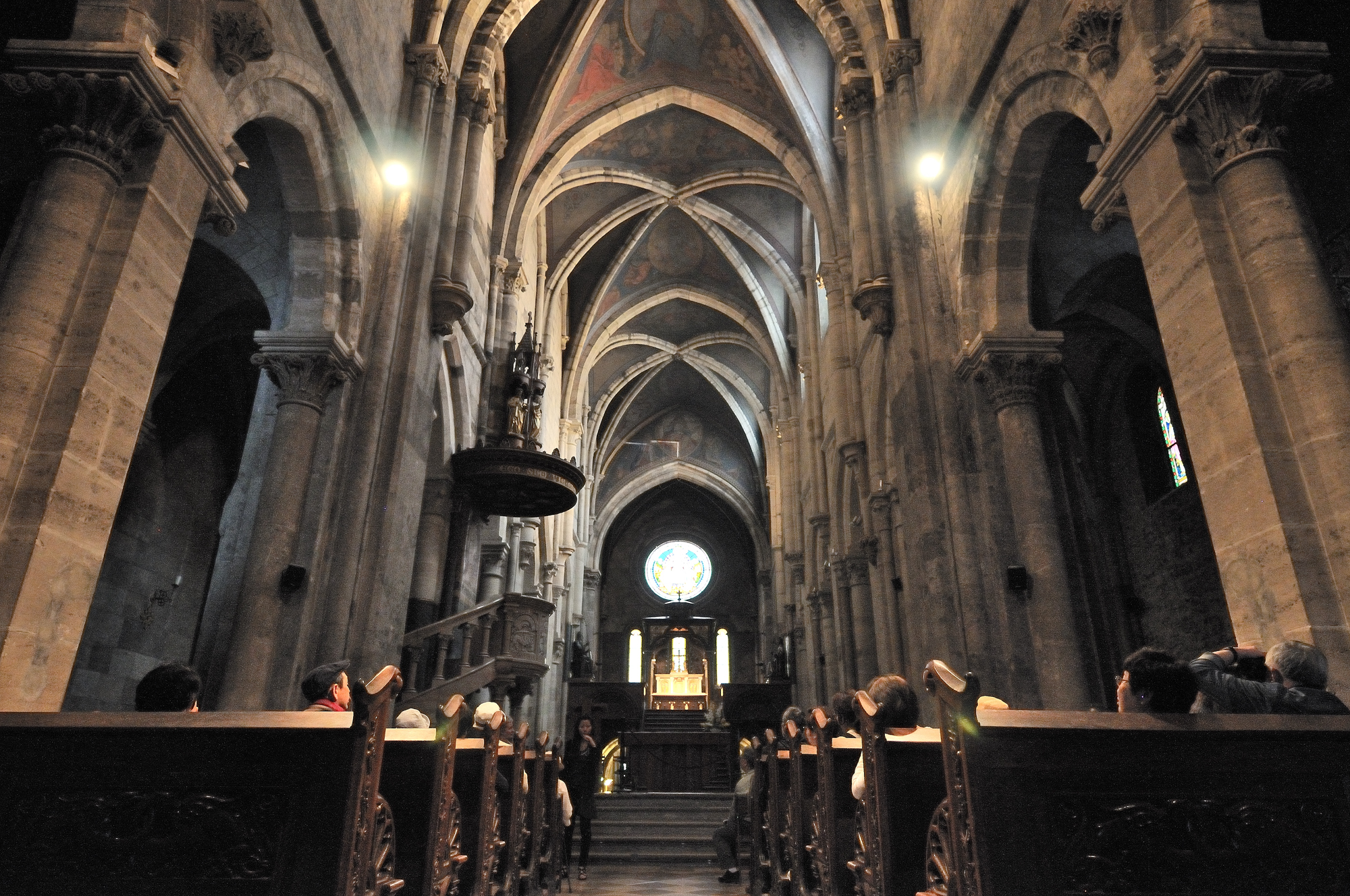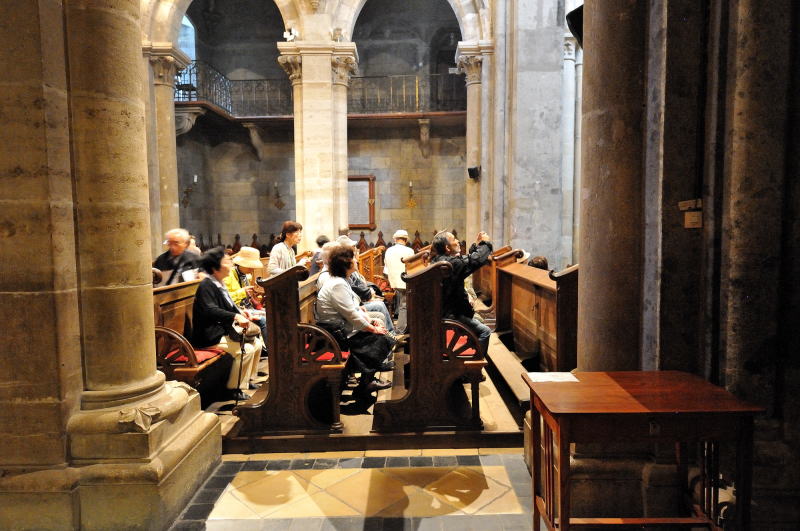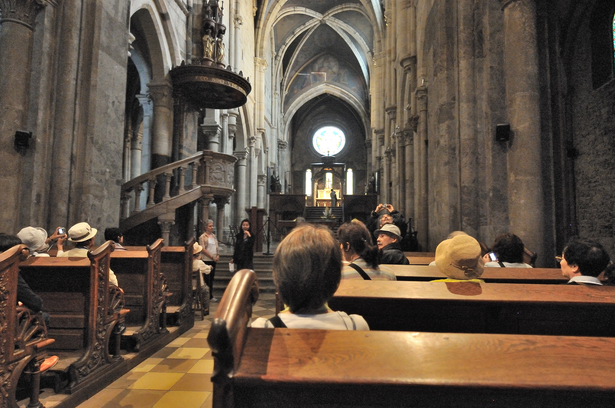 中央前方にあるのが主祭壇で、中世に造られた教会の多くは東に主祭壇を、西に正面入口が設けられている。 これは朝には主祭壇に立つ司教さんに後光差し、夕方には正面入口が夕日に照らされ、天国への入口をイメージさせる視覚効果があると言われてる。 |