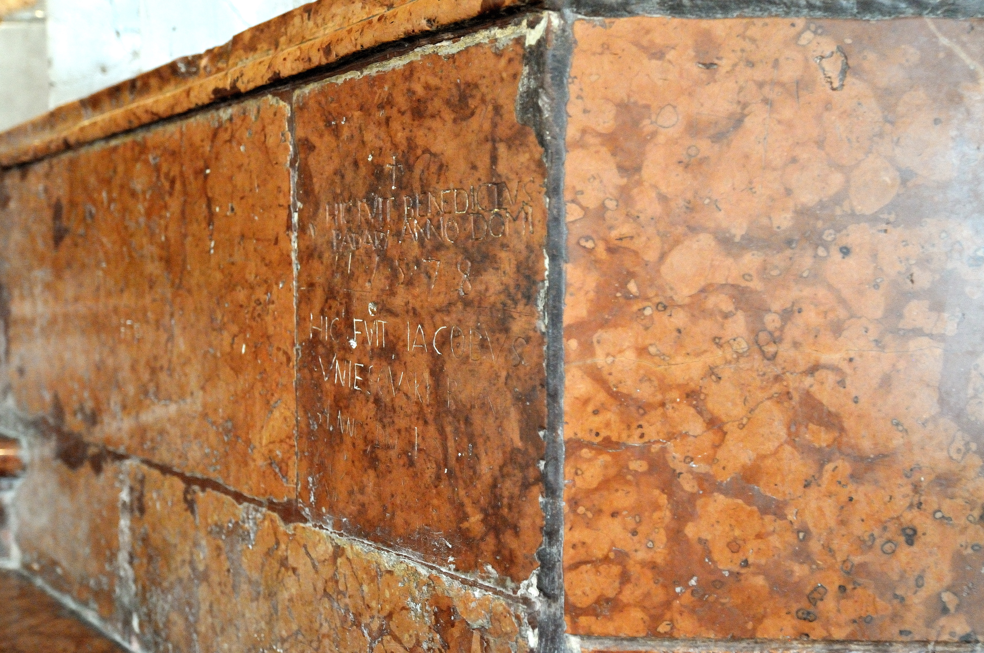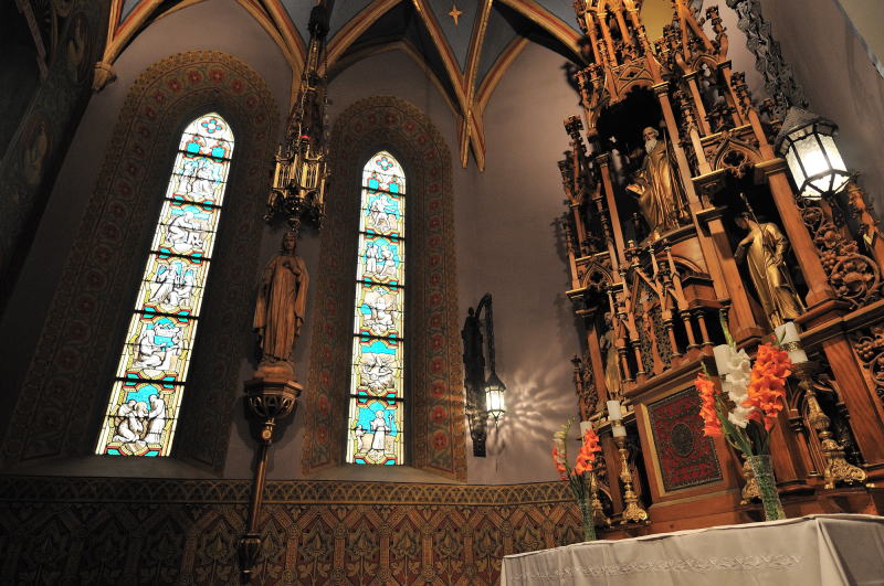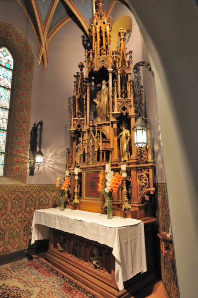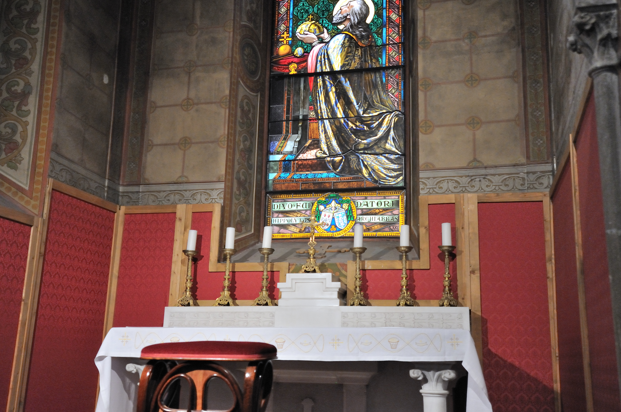 祭壇の左手に、壁に嵌め込まれた四角い石碑は、、妻ステファニーの墓石。 |