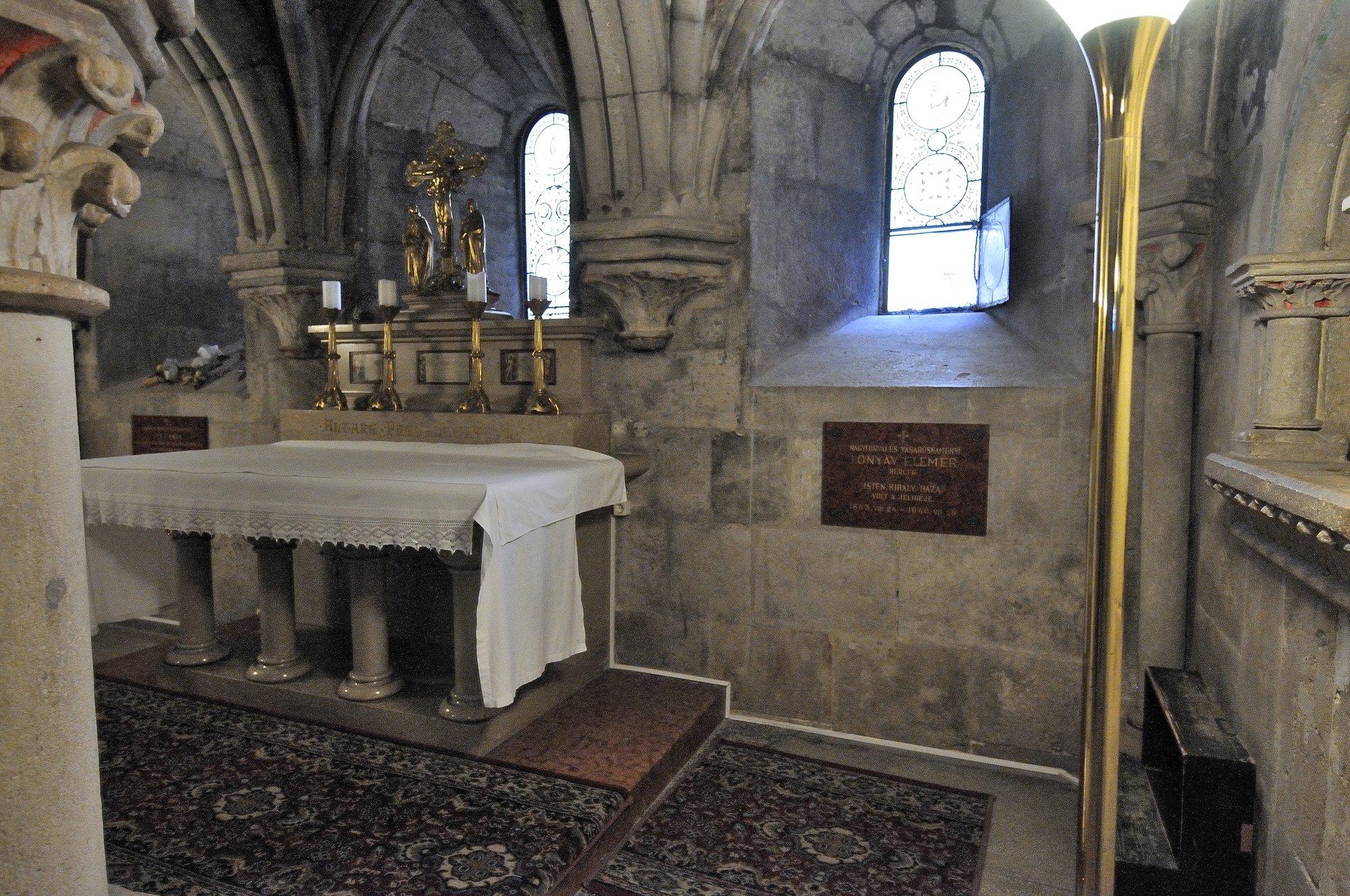祭壇の右手に、壁に嵌め込まれた四角い石碑は、ステファニーの二回目の夫、ローニャイ・エレメール伯爵の墓石。 |