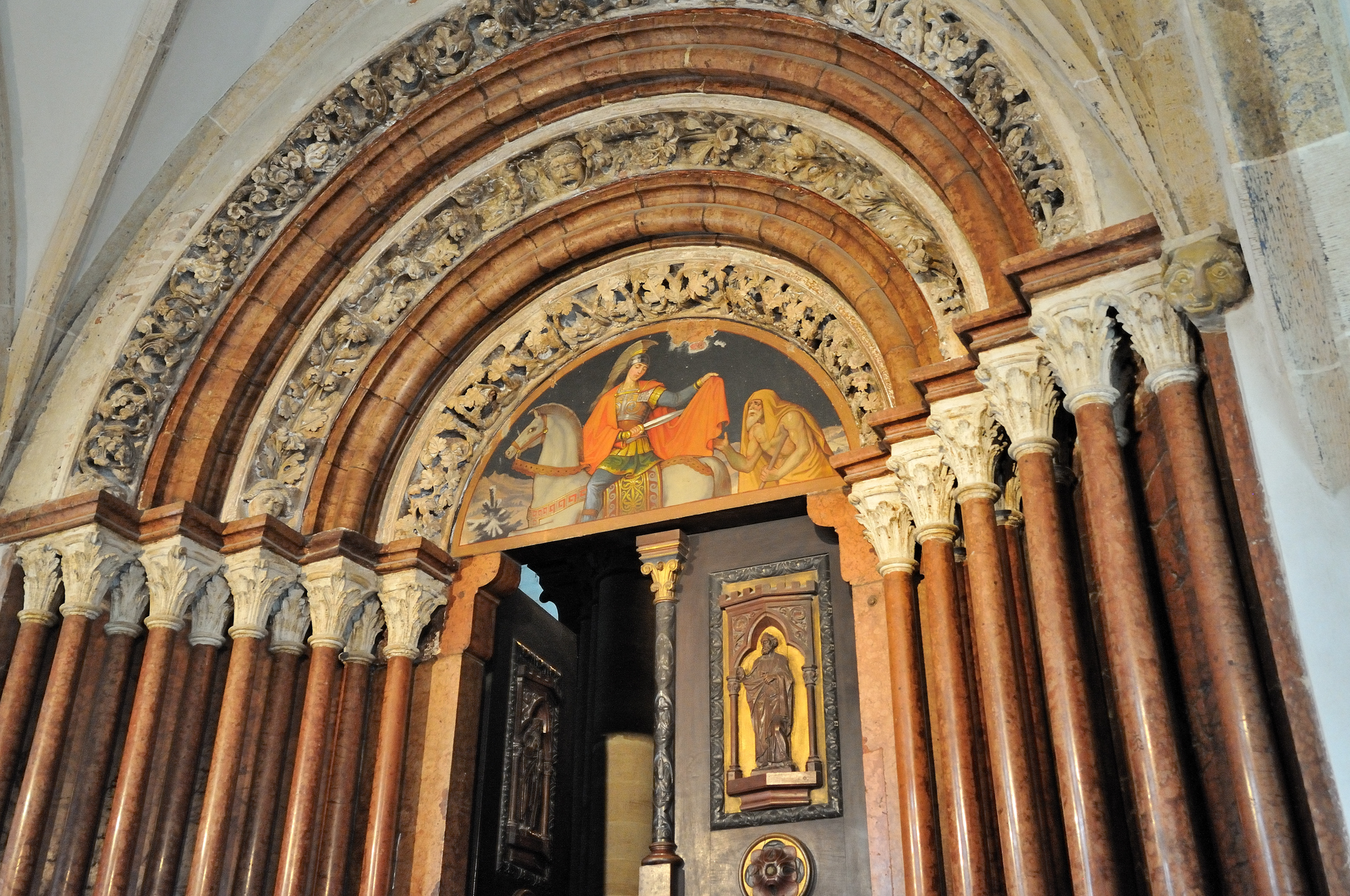 この教会は過去3回の増改築が行われているが 、残されている最も古い建築物は写真右の壁面で、1100年代の物と言われている。 中央の丸い近代的なステンドグラスの中に描かれている人物は聖人マールトン [Szent Márton] で、彼は316年ごろ、ローマ帝国領パンノニア州 (現ハンガリー) サバリアに生まれる。 397年 (一説には400年) にトゥーレーヌのカンドで没。 ローマ帝国軍の将校であった父の転任で、子供の頃パヴィーアへ移住し、のちにローマ軍に入隊した。 所属する連隊が、しばらくしてガリアのアミアンに派遣された時、「マントの伝説」が起こる。 ある非常に寒い日、アミアンの城門で、マールトンは半裸で震えている物乞いを見た。 彼を気の毒に思ったマールトンは、自分のマントを持っていた剣で引き裂、半分を物乞いに与えた。 そして、その夜、彼は夢を見る。 なんと、この物乞いがイエス・キリストであったことを悟る。 これが受洗のきっかけとなり、その後軍を除隊したマールトンは多くの善行を積んだ後、列聖される。 マールトンは生前に列聖された最初の人物で、彼が持っていた半分のマントは、「聖マールトンのマント」として、フランク王国の歴代国王の礼拝堂に保管されている。 |