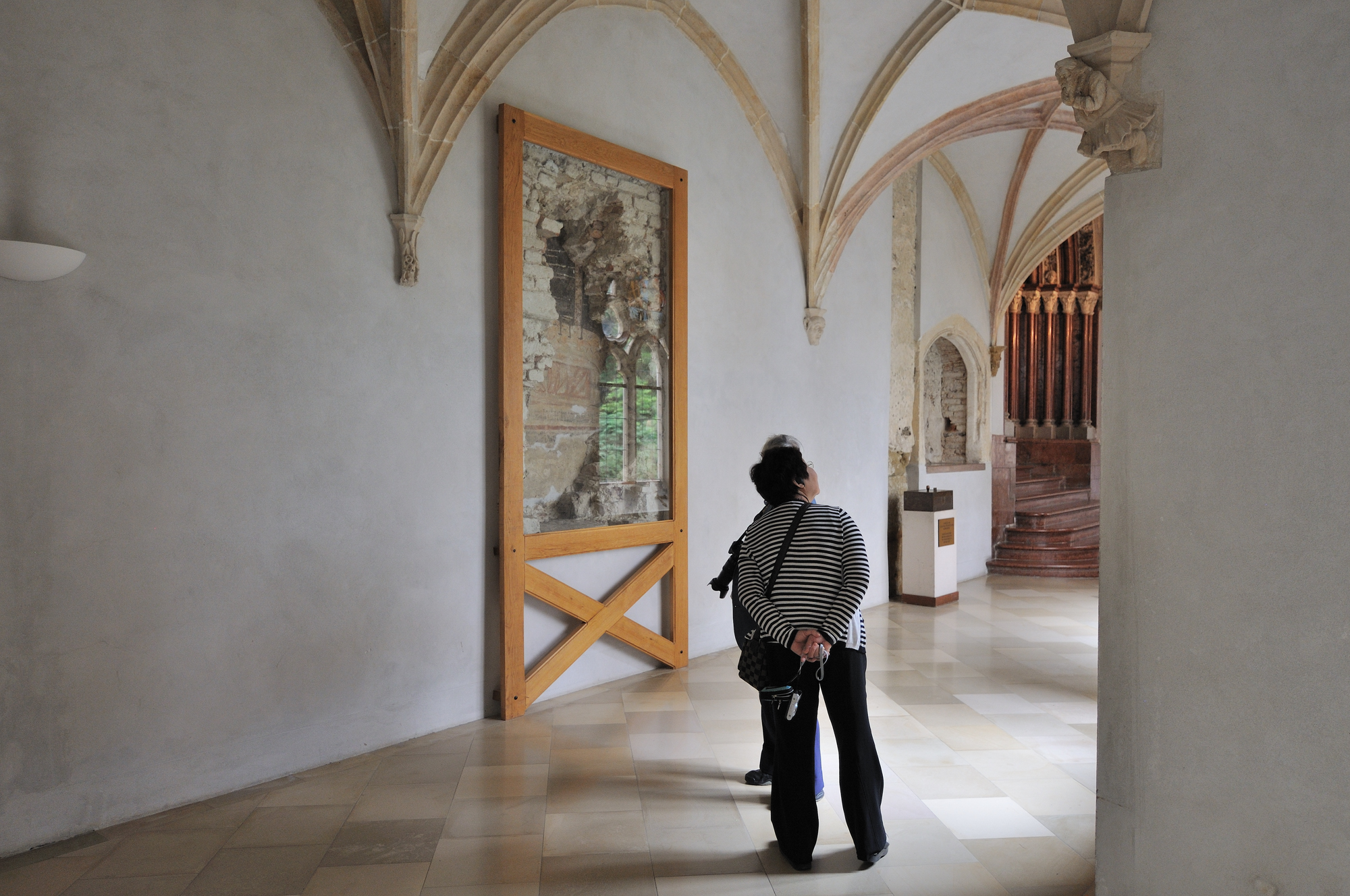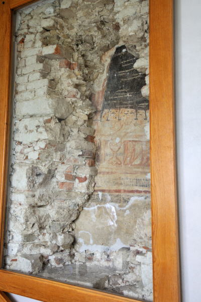 この部分は故意に残した物で、壁の一部をガラス張りで覆い、展示物としている。 絵の描かれた奥の壁は12世紀に造られたもので、黒い部分はイエスキリストを描いたものと想像されている。 分厚い煉瓦壁の部分はこの回廊が造られた1486年頃のもの。 |