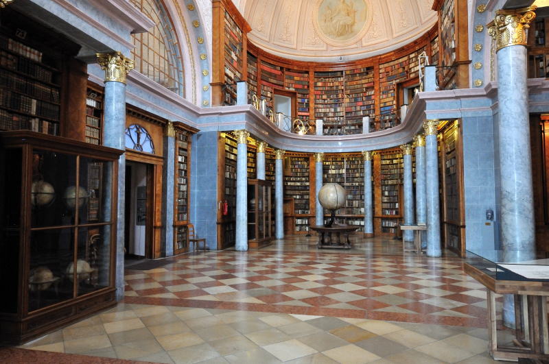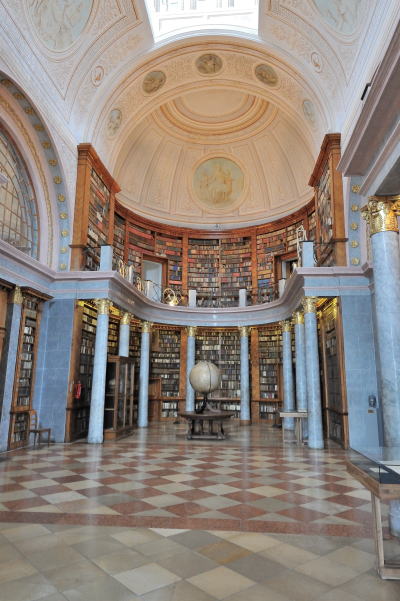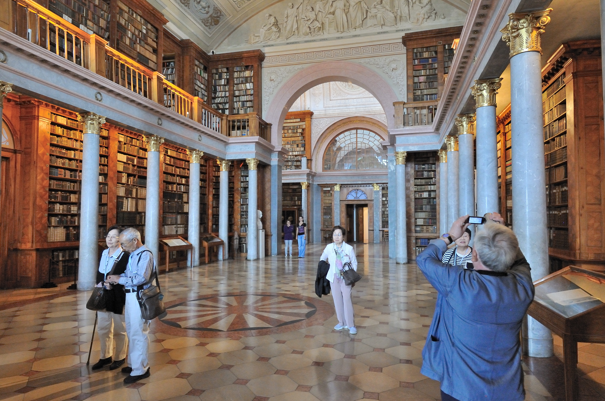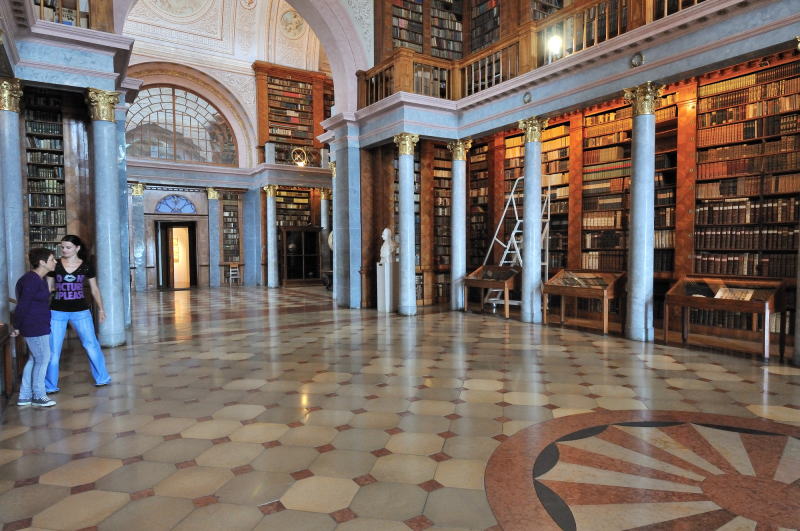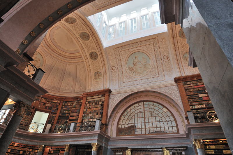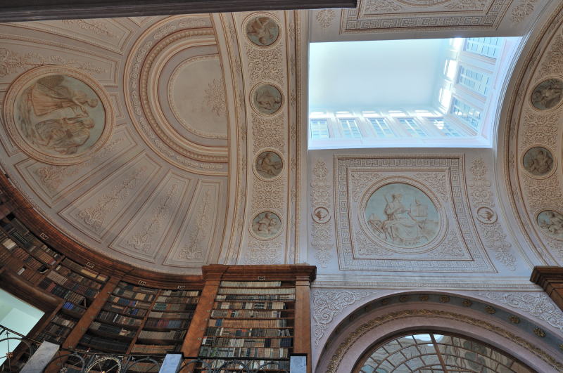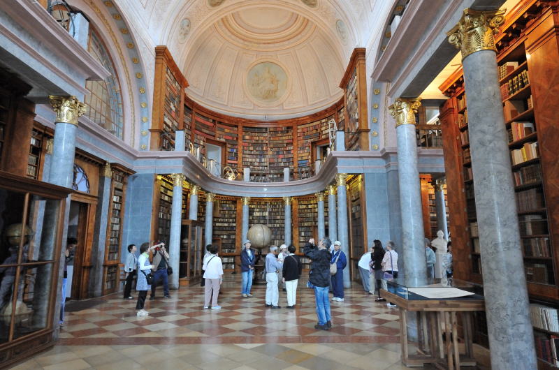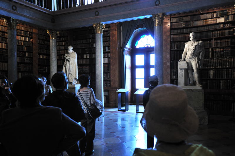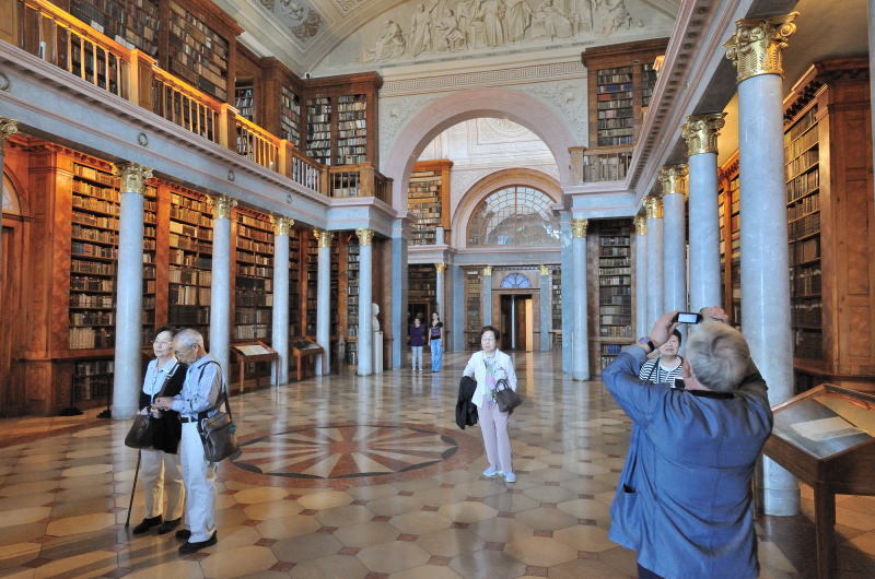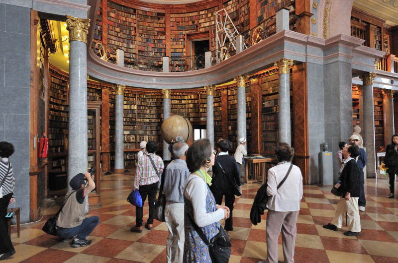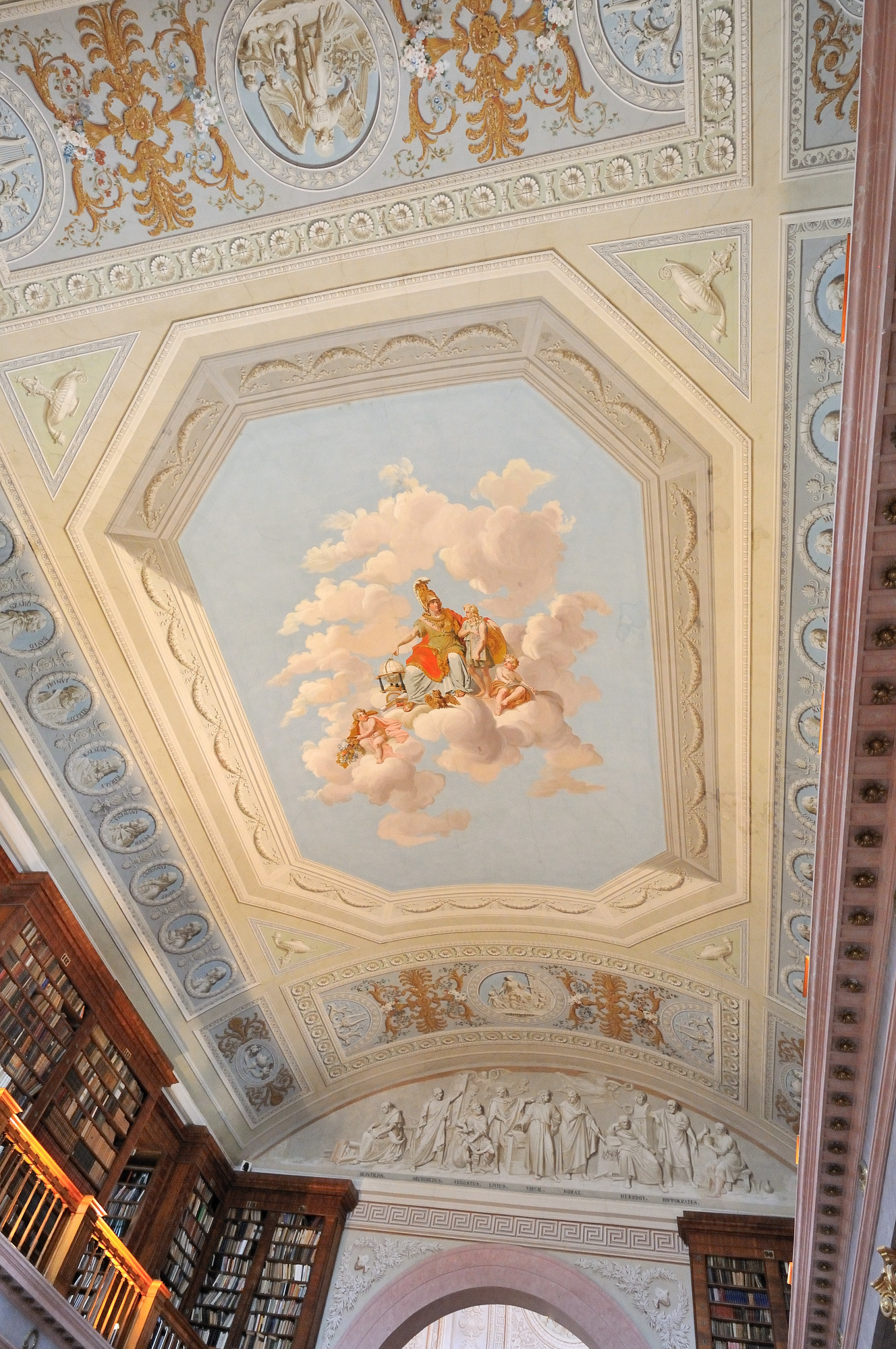 40万冊以上の蔵書を誇る図書館 (古文書館)で、天井は凸凹して見えるが実は平面に書かれた騙し絵。 |